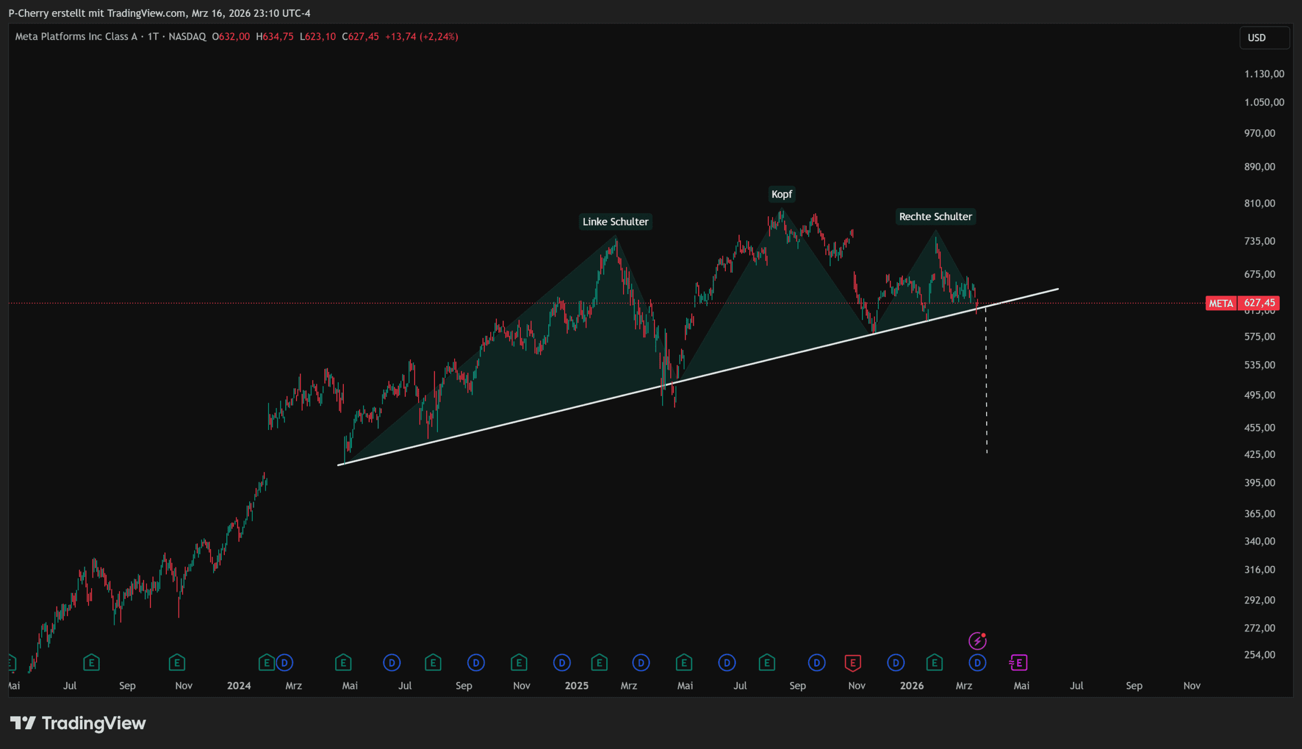 Der Kurs der Meta-Aktie verlor zwischenzeitlich rund -27% von seinem Allzeithoch bei rund 795 US$. Wie im Chartbild ersichtlich hat sich ein Kopf- & Schulter-Muster (engl. Head- & Shoulders-Pattern) gebildet. Dies ist ein bärisches Muster, das auf kommende Abverkäufe hindeutet. Das technische Preisziel für dieses Muster liegt bei rund 427 US$.