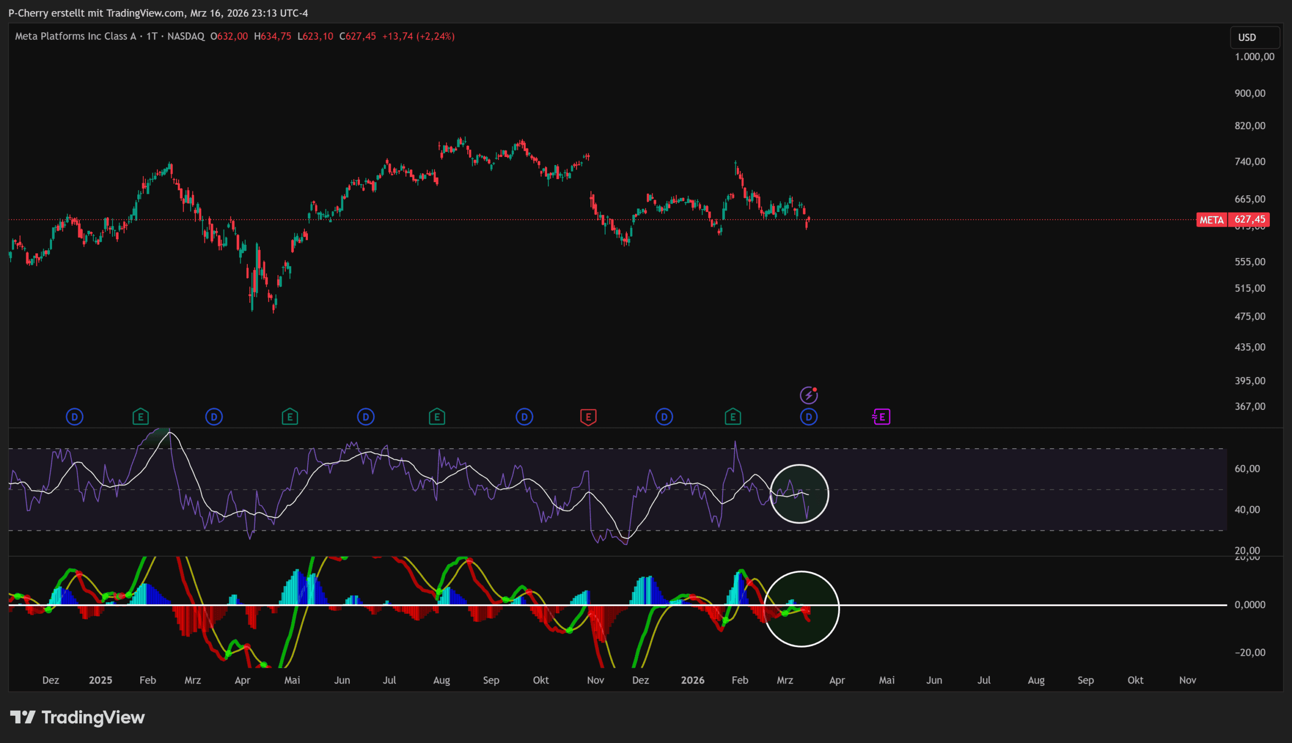Die Indikatoren im Tageschart wirken aktuell pessimistisch. Beide Indikatoren haben ein bärisches Crossover ausgebildet und das Momentum im MACD ist ansteigend bärisch. Auch auf Wochenbasis hat die Meta Platforms-Aktie jeweils ein bärisches Crossover ausgebildet.