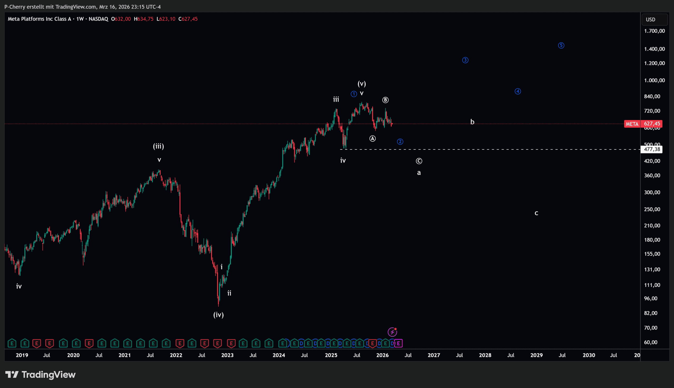 Die Elliott-Wellen-Analyse im Wochenchart zeigt, dass sich der Meta Platforms-Kurs potenziell am Ende eines größeren Zyklus befindet. Es ist eine fünfteilige auf mehreren Wellengraden zu identifizieren, was eine größere Korrektur zur Folge haben könnte. Ein Unterschreiten des lokalen Tiefs der Welle 4 (röm. iv) bei 477,37 US$ würde dieses Szenario bestätigen.
