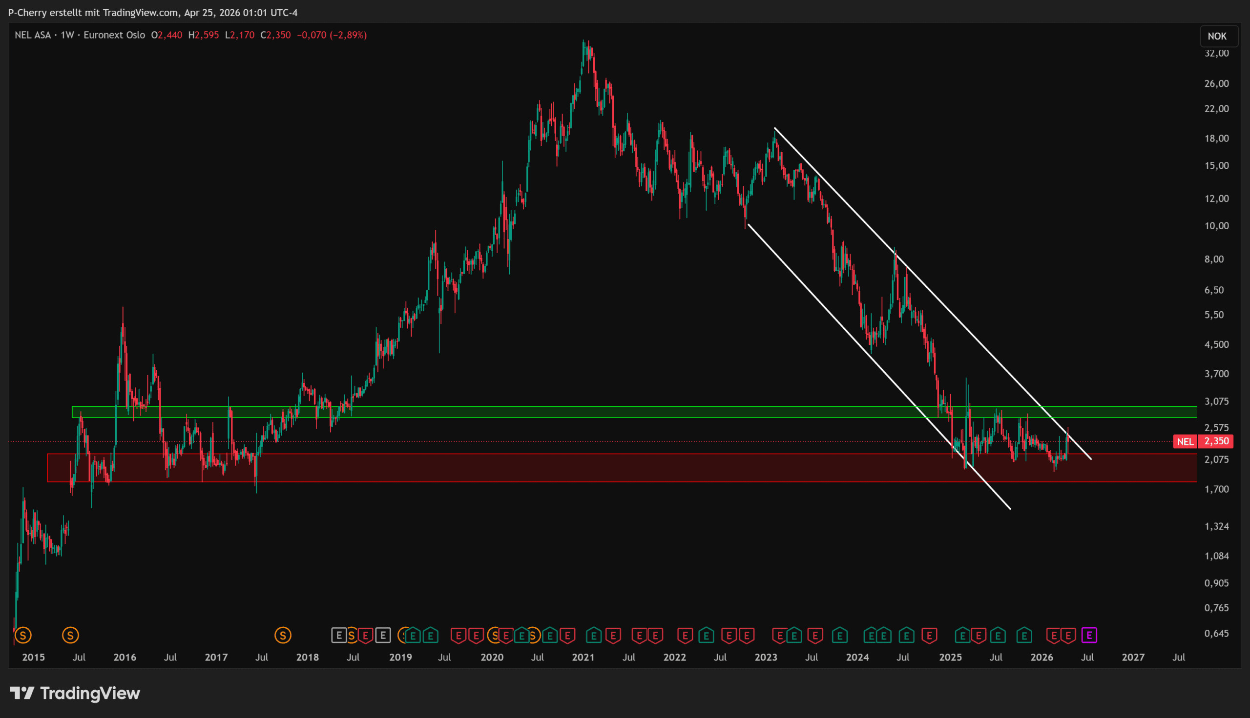 Der Nel ASA-Kurs stieg vom lokalen Tief zeitweise über +35% an, bevor ein Rückschlag von -16% den Kurs wieder unter Druck setzte. Nachdem die Unterstützungszone in den vergangenen Monaten mehrfach angetestet wurde, versuchte der Kurs der Wasserstoffaktie, aus dem abfallenden Trendkanal auszubrechen. Doch ein nachhaltiger Ausbruch blieb bislang ohne Erfolg.