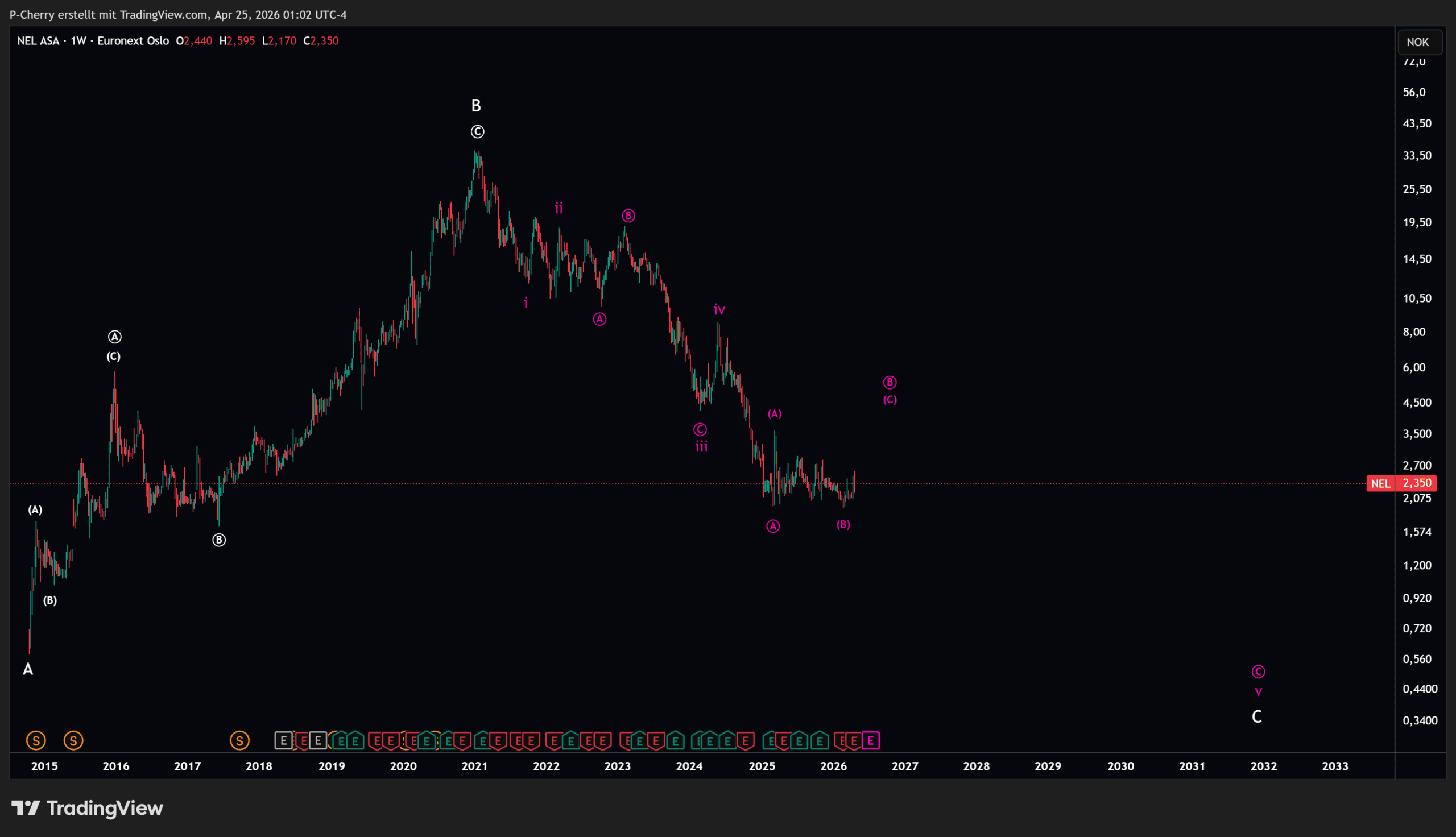 Die Elliott-Wellen-Analyse im Wochenchart zeigt, dass sich der Nel ASA-Kurs in einer stärkeren, technischen Gegenbewegung in einer B-Welle befinden könnte. Im großen Bild ist jedoch erkennbar, dass das Allzeithoch in einer korrektiven Struktur (A-B-C) ausgebildet hat, was darauf schließen lässt, dass mittel- bis langfristig mit einem neuen Allzeittief gerechnet werden muss.