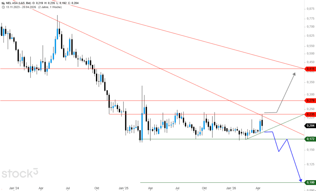 Die Nel ASA-Aktie verlor vom Hochpunkt im Jahr 2024 ausgehend in der Spitze bereits rund -80%. Eine Trenddefinition braucht es bei einem solchen Ausverkauf gewiss nicht, und doch muss einem klar sein, dass eine Aktie von 1 € auf 0,10 € und sogar auf 0,01 € fallen kann. Prozentuale Angaben sind daher stets mit Vorsicht zu genießen, und doch scheint das Ende bei diesem Trauerspiel rund um Wasserstoff noch nicht gefunden. Rufen hier die 0,10 € je Anteil?