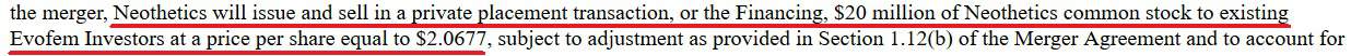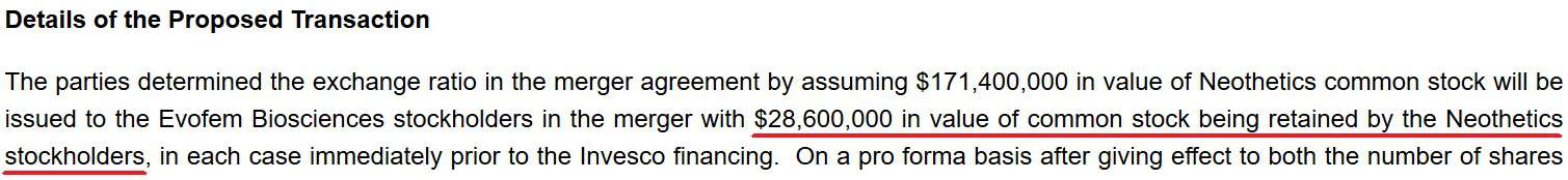 Im Rahmen des Merger-Deals wurde Neothetics mit einem Wert von 28,6 Millionen USD bedacht, was einem Aktienpreis von rund 2,07 USD entspricht. Auf genau dieser Bewertungsbasis wird gemäß Vereinbarung mit Invesco eine der größten unabhängigen Investmentgesellschaften der Welt ihren Anteil an der zukünftig börsengehandelten Evofem unmittelbar nach Merger-Abschluss aufstocken und noch einmal 20 Millionen USD investieren.