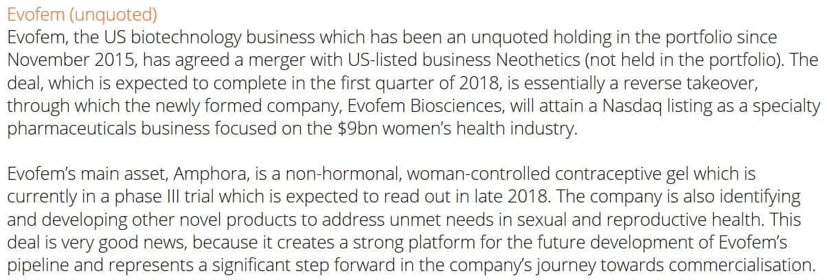 Das aktuelle Neothetics und zukünftige Evofem würde nach Transaktionsabschluss und der folgenden Invesco-Finanzierung sowie auf Basis des letzten Schlusskurses von 1,74 USD auf eine Bewertung von voraussichtlich knapp 185 Millionen USD kommen - fundamental gesehen zu wenig für ein MPT-Produkt in einem viele Milliarden schweren Markt, das seine Sicherheit und Effektivität bereits in einer ersten Phase-3-Studie nachgewiesen hat. Zudem erfährt Evofem herausragende institutionelle Unterstützung: Neben Invesco ist auch der britische Star-Fondsmanager Neil Woodford mit von der Partie.