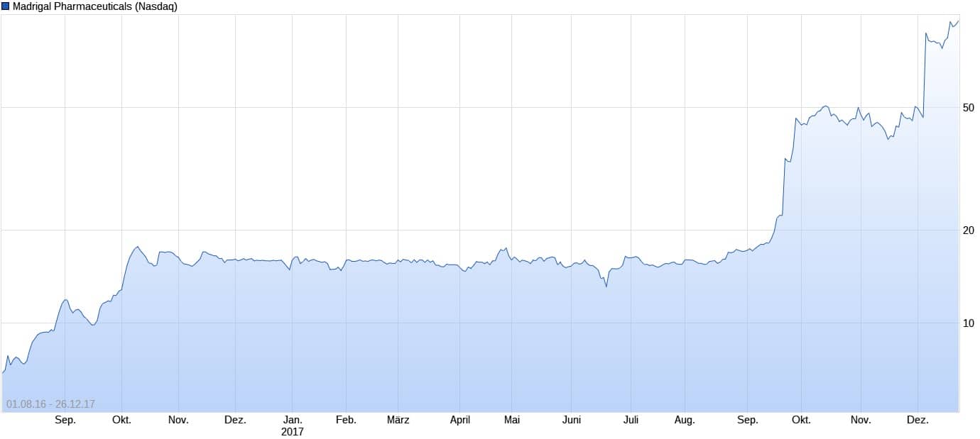 Die Madrigal-Aktie konnte seit dem Merger im vergangenen Jahr mittlerweile mehr als +1.000% an Wert hinzugewinnen. Quelle: ariva.de
