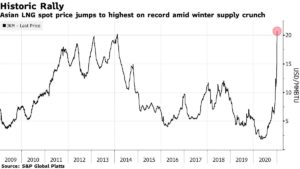 Wegen niedrigerer Förderkapazitäten in den USA, einem dort höheren Verbrauch durch einen harten Winter sowie wegen Transportengpässen bei den entsprechenden Transportschiffen, schossen Ende Januar bis Anfang Februar die LNG-Preise in einigen asiatischen Ländern plötzlich durch die Decke von im Schnitt 5-10 auf 20-30 USD pro Million BTU (mmBTU).
