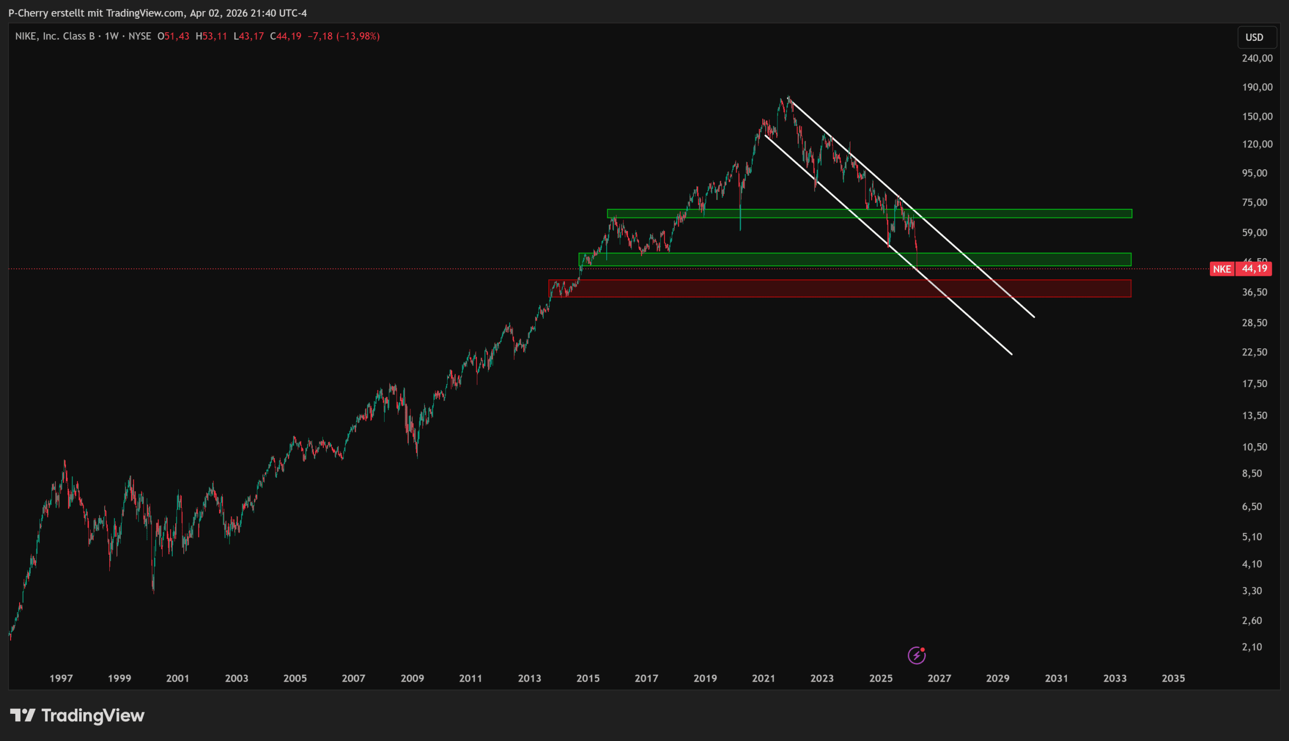 Der Kurs der Nike-Aktie hat den aktuellen Supportbereich gestern leicht nach unten unterschritten. Damit rückt der nächste strukturelle Support in den Fokus, welcher zwischen 35,33 US$ und 40,54 US$ liegt.