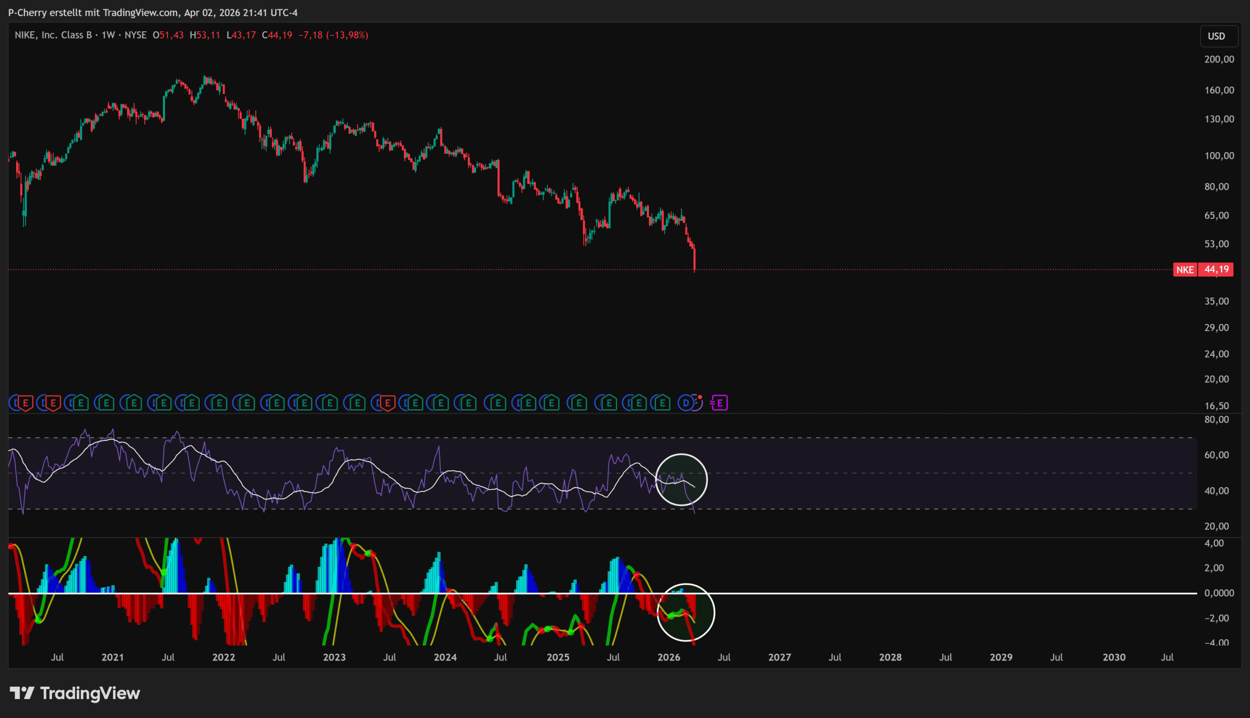 Die Nike-Aktie bleibt klar in einer bärischen Trendstruktur, nachdem der Kurs den Support unterschritten und den Abwärtstrendkanal bestätigt hat. RSI und MACD liefern im Wochenchart deutliche Verkaufssignale, wobei das zunehmende Momentum den Druck weiter erhöht.