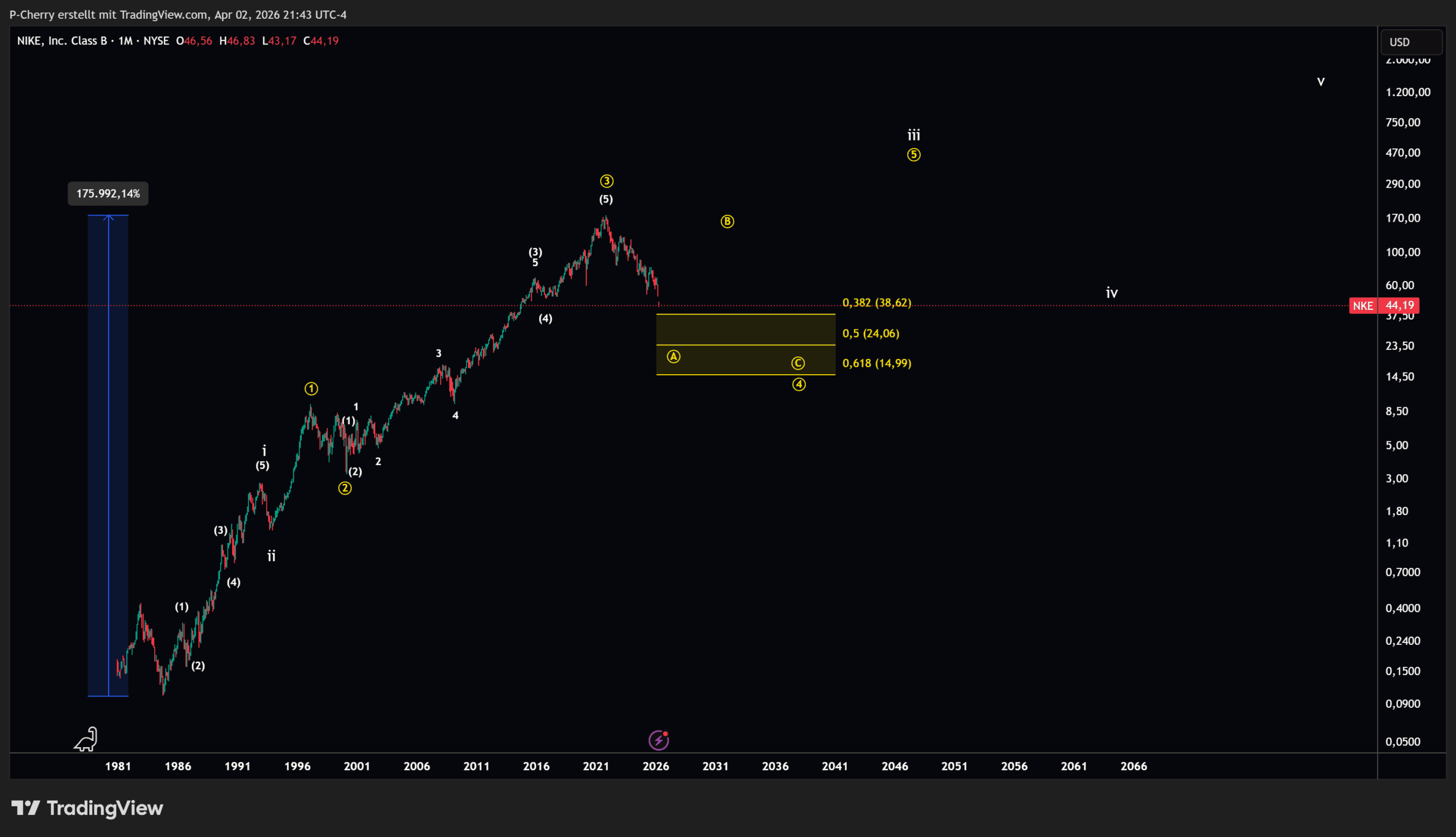 Der Nike-Kurs zeigt aktuell Schwäche. Die Elliott-Wellen-Zählung zeigt einen fortgeschrittenen Verlauf in der A-Welle einer A-B-C-Korrektur auf. Nach Abschluss der Welle A könnte es zu einer größeren technischen Gegenbewegung kommen. Der Kurs des Sportartikelherstellers hat in den vergangenen 40 Jahren rund +176.000 Prozent zugelegt, daher sind auch größere Gewinnmitnahmen nicht überraschend.