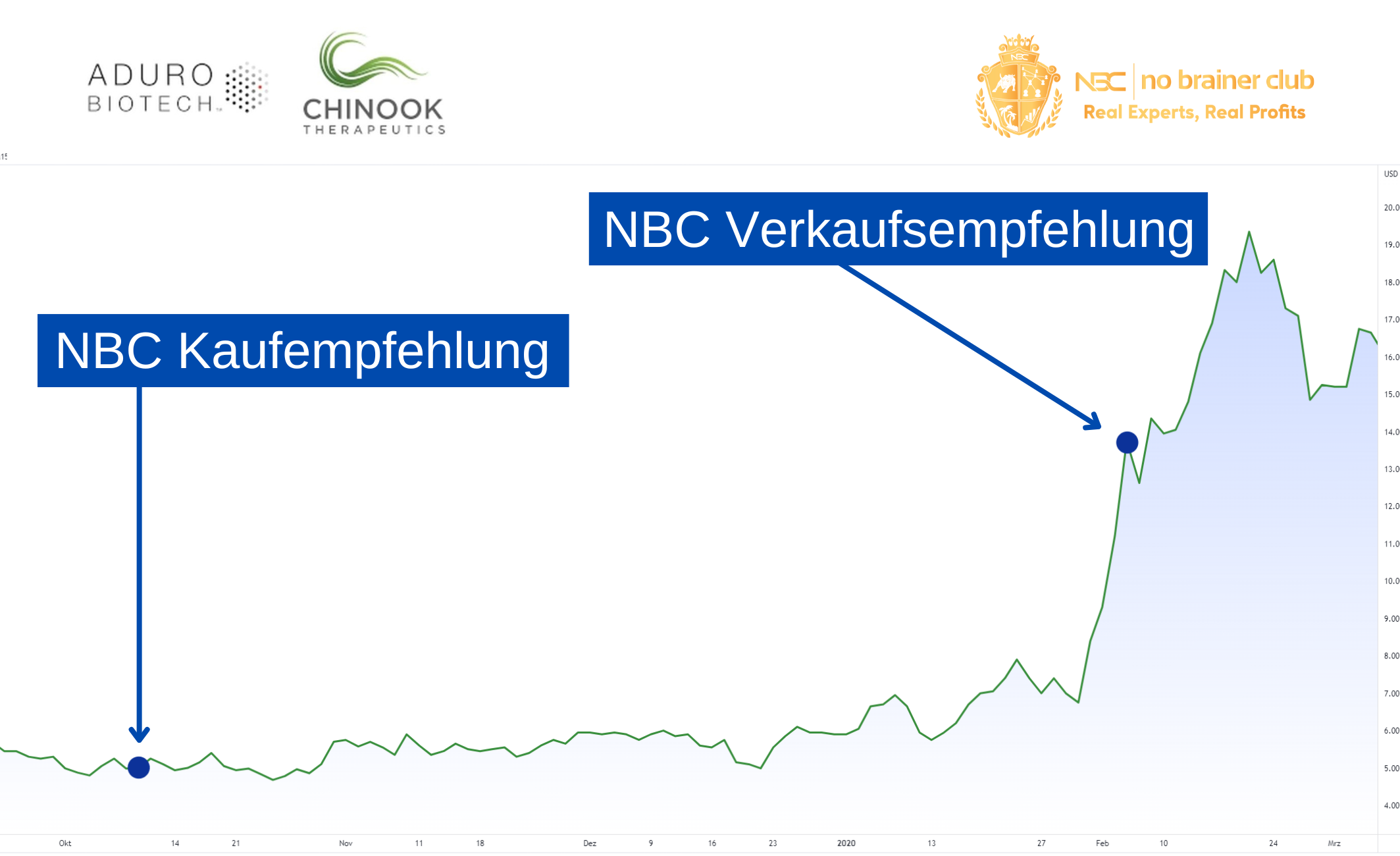 Absolute Geschenke in miesem Umfeld mit Aduro (heute Chinook Therapeutics): Bombastische Kassenbestände und hochqualitative Assets sorgten in nur wenigen Monaten für eine Kursrallye von +186%. NBCler wie immer am Feiern!
