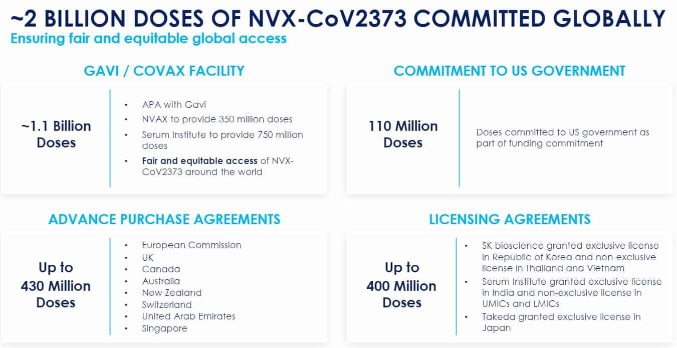 Novavax ist ein in Gaithersburg, Maryland, ansässiges Biotechunternehmen, das Impfstoffe gegen Infektionskrankheiten wie Grippe oder Ebola entwickelt. Die Studien zum proteinbasierten Wirkstoff gegen das Coronavirus waren erfolgreich – so konnte eine Wirksamkeit von 93,2% gegen eine Ansteckung gezeigt werden, sodass Novavax nun Zulassungen in mehreren Erdteilen anstrebt oder bereits vermelden konnte.
