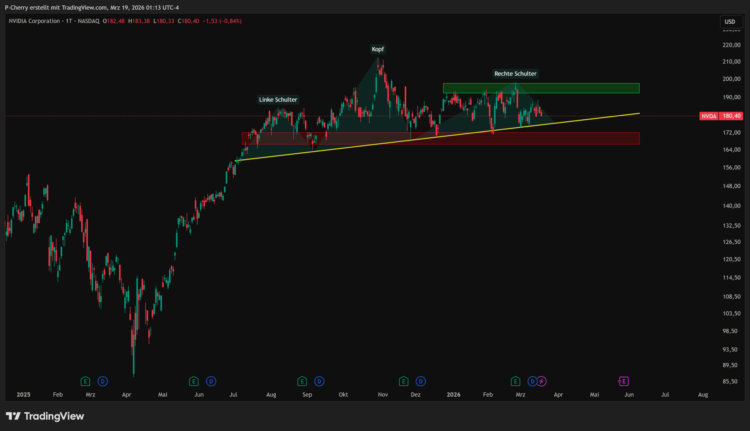 Im Nvidia-Kurs zeichnet sich aktuell eine klassische Kopf-Schulter-Formation (engl. Head- & Shoulders-Pattern) ab, die als bärisches Umkehrsignal gewertet wird. Die linke Schulter, der Kopf sowie die rechte Schulter sind klar erkennbar, während die gelbe Aufwärtstrendlinie gleichzeitig als entscheidende Unterstützung fungiert.
