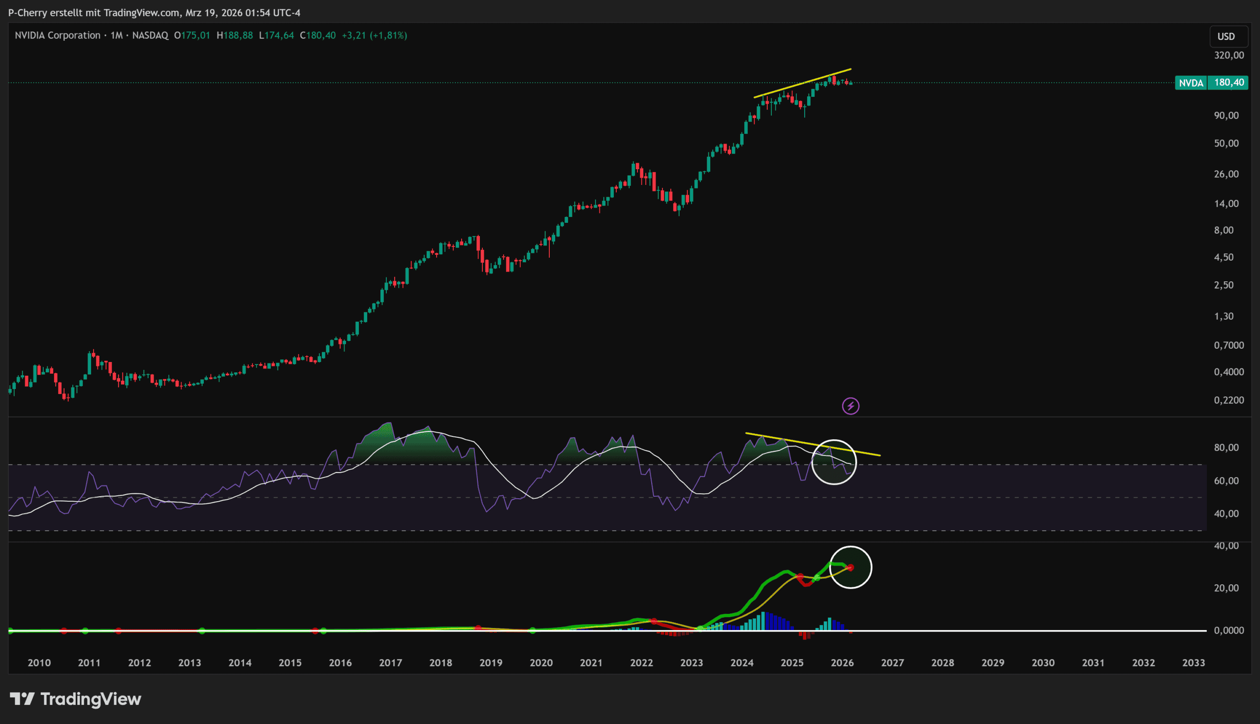 Die Indikatoren im Monatschart senden klare Warnsignale. Sowohl RSI als auch MACD haben bärische Crossovers ausgebildet, während zusätzlich eine bärische Divergenz im RSI vorliegt. Insgesamt deutet die Kombination dieser Signale auf nachlassendes Momentum und ein erhöhtes Risiko für eine weiter fallende Kursentwicklung hin.