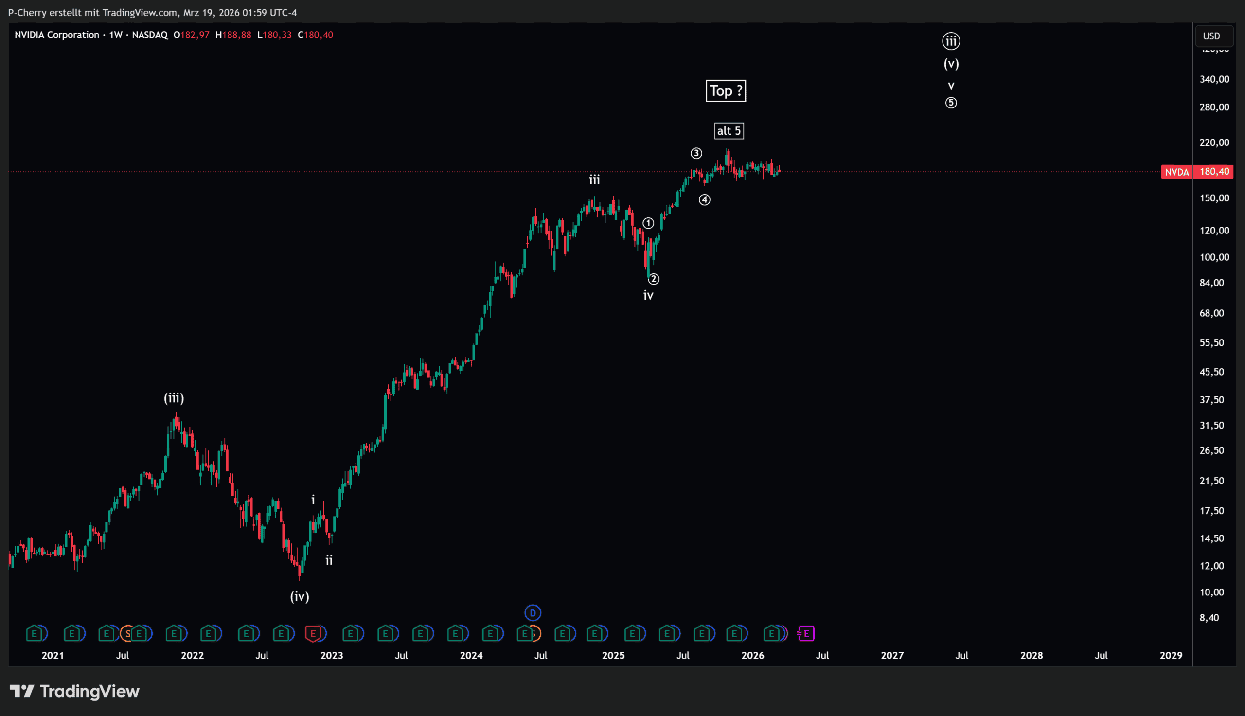 Die Elliott-Wellen-Analyse im Wochenchart zeigt, dass sich der Nvidia-Kurs potenziell am Ende eines größeren Zyklus befindet. Es ist eine fünfteilige Bewegung seit dem lokalen Welle 4-Tief vom 07. April 2025 zu identifizieren, was eine größere Korrektur zur Folge haben könnte. Ein Unterschreiten des lokalen Tiefs der Welle 4 (röm. iv) bei 86,62 US$ würde dieses Szenario bestätigen.