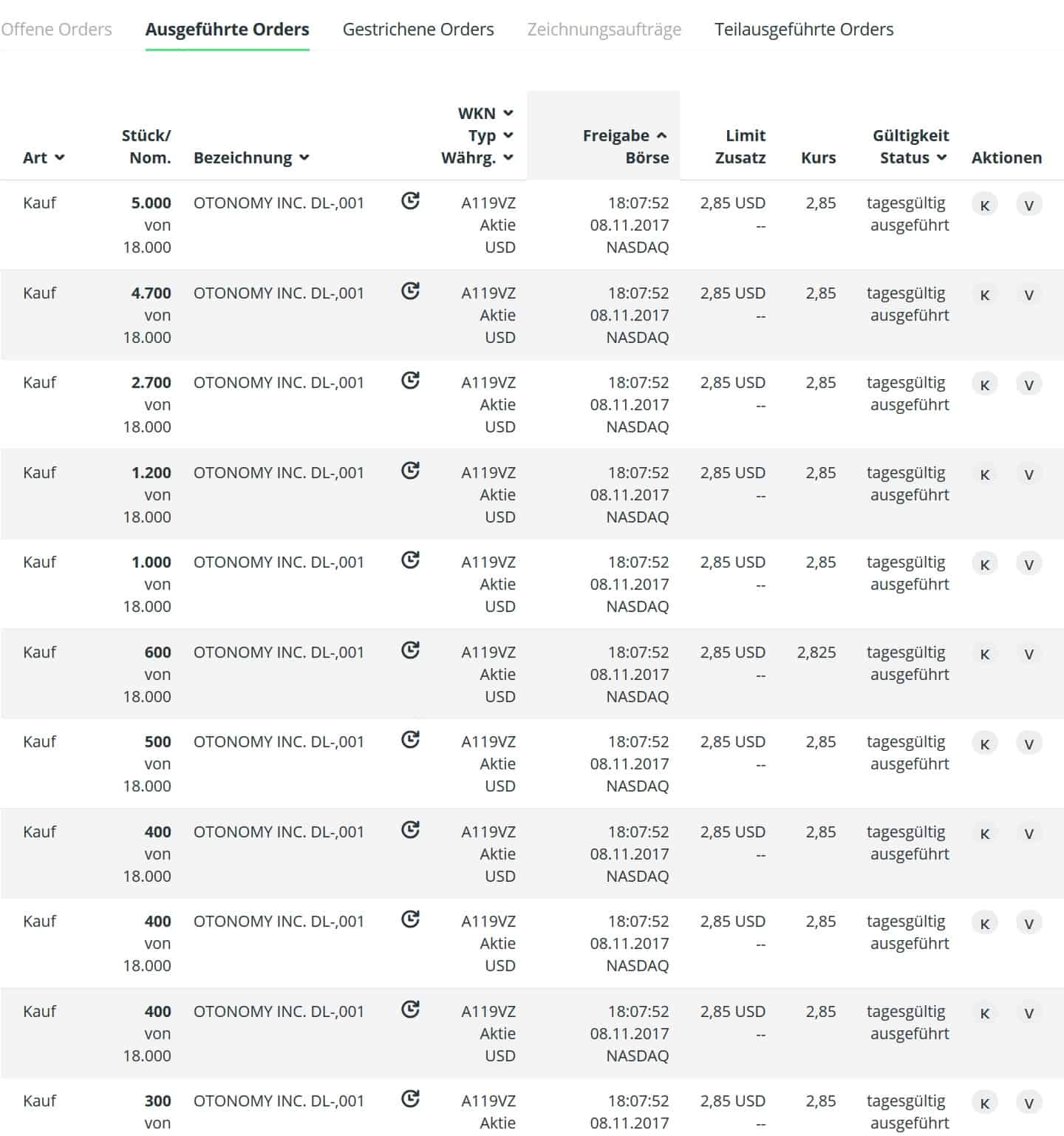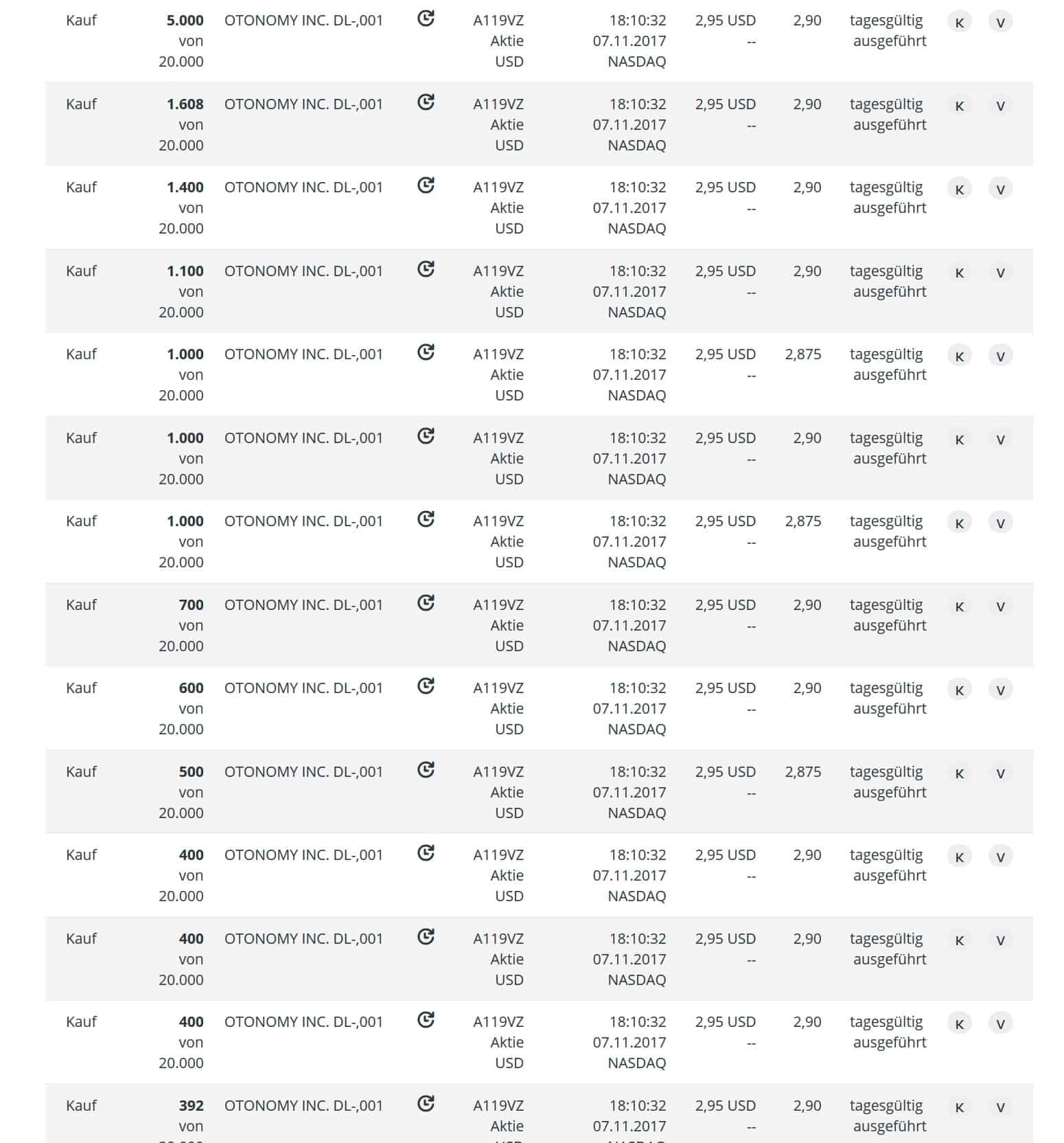 SD-Chefmoderator "Hai" war in den vergangenen Tagen bereits fleißig dabei, sich mit Otonomy-Aktien einzudecken, wie unter anderem ein Auszug auf seine Trades von gestern und heute zeigt. Einige Nutzer unseres Live Chats konnten möglicherweise schon zwischen den Zeilen lesen und hatten sich ebenfalls positioniert. Das jetzige Kursplus muss jedoch noch nicht das Ende der Fahnenstange sein: Wir sehen die Aktie bei zunächst 7 bis 9 USD als fair bewertet an, bevor weitere Details zum weiteren Zulassungsprozess bekannt werden oder die Entscheidung zur Indikationserweiterung für OTIPRIO erfolgt. Wer jedoch schon investiert war, sollte auch vor zeitnahen Gewinnmitnahmen nicht zurückschrecken.