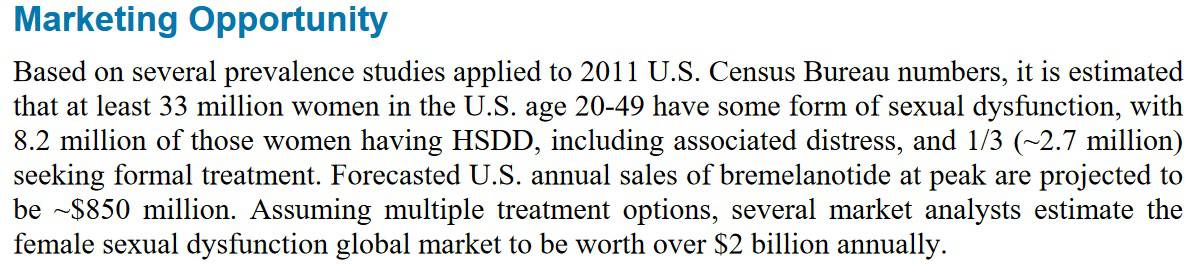 Bremelanotides einziger FDA-zugelassener Wettbewerber, die Pille Addyi, wurde 2015 zusammen mit seinem Hersteller Sprout Pharmaceuticals für 1 Milliarde USD in Cash zuzüglichen Meilensteinen vom kanadischen Valeant-Konzern aufgekauft. Bremelanotide hat bekanntlich unschlagbare Vorteile gegenüber Addyi, da es "as needed" kurz oder bis zu einem halben Tag vor einem sexuellen Ereignis eingenommen werden kann und zudem mit Alkohol verträglich ist. Addyi hat zudem eine "Black Box Warning" - der Umsatztod für jedes Medikament.