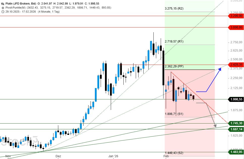 Seit dem Preissturz von Ende Januar versucht sich Platin an einer Stabilisierung. Das Level der runden Marke von 2.000 US$ je Unze bot sich dabei direkt an, und so zeigt sich während der vergangenen Wochen exakt dort eine Nachfragezone, welche bisher zur Stabilisierung führte.