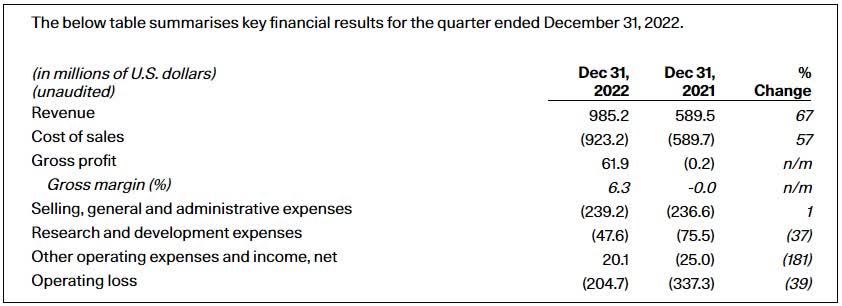 So hat der Hersteller zwischen Oktober und Dezember rund 21.000 Fahrzeuge ausgeliefert und damit sein bisher bestes Quartal erzielt. Der Umsatz in Berichtzeitraum stieg infolgedessen gegenüber dem Vorjahr um über zwei Drittel auf fast eine Milliarde US$. Zudem gelang den Schweden im Gegensatz zu vielen anderen E-Auto-Start-ups, die Bruttomarge zu erhöhen und die Kosten unter Kontrolle zu halten (siehe Tabelle unten).