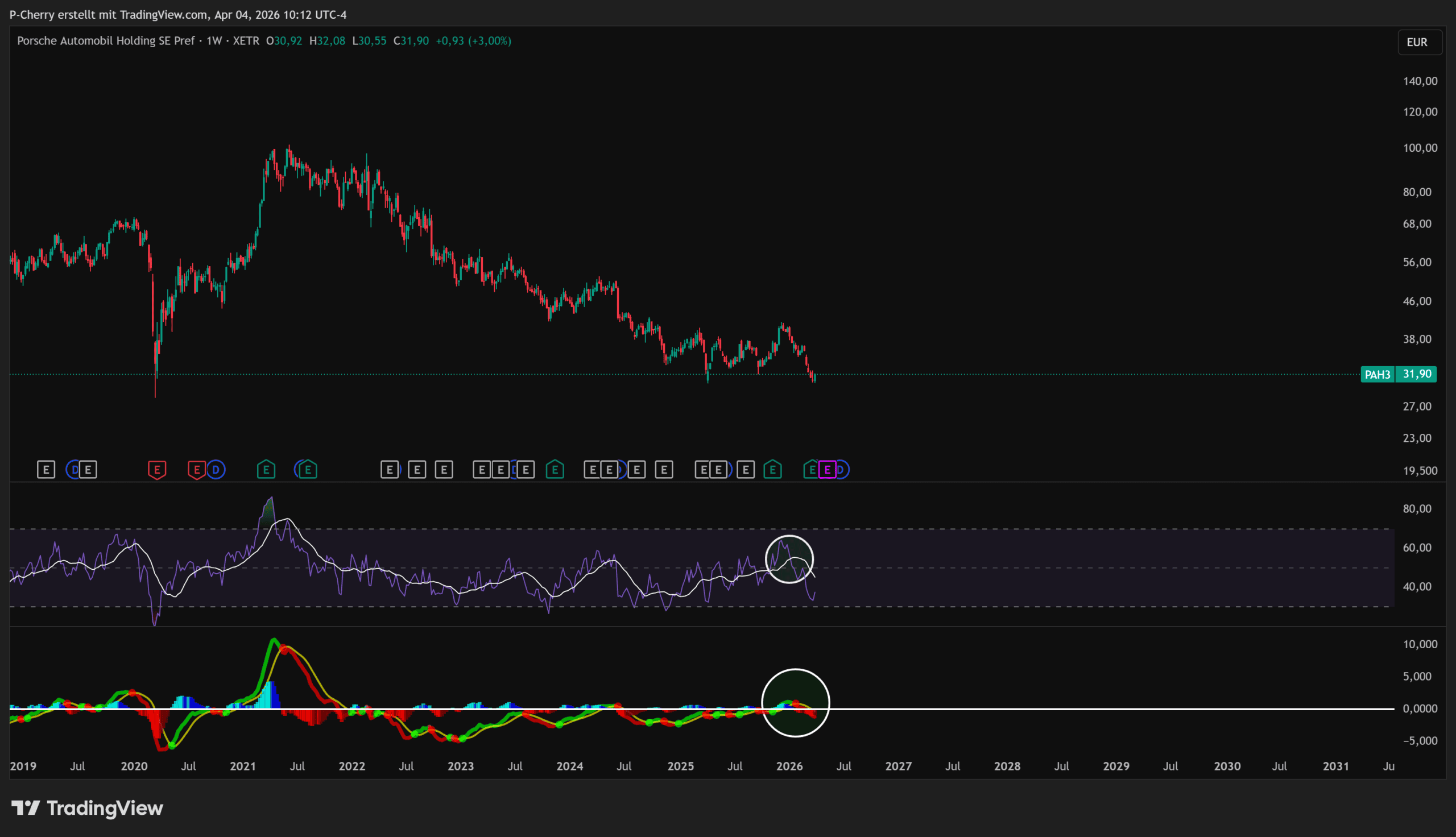 Gleichzeitig befindet sich der Kurs der Porsche-Aktie am Supportbereich, der in den letzten Jahren mehrfach gehalten hatte. Diese Unterstützung liegt zwischen 27,52 € und 30,55 €. Sollte die Unterstützung halten, wäre dies ein bullisches Zeichen für den Porsche-Kurs. Ein nachhaltiger Durchbruch nach unten würde den Preis auf ein 6-Jahres-Tief führen.