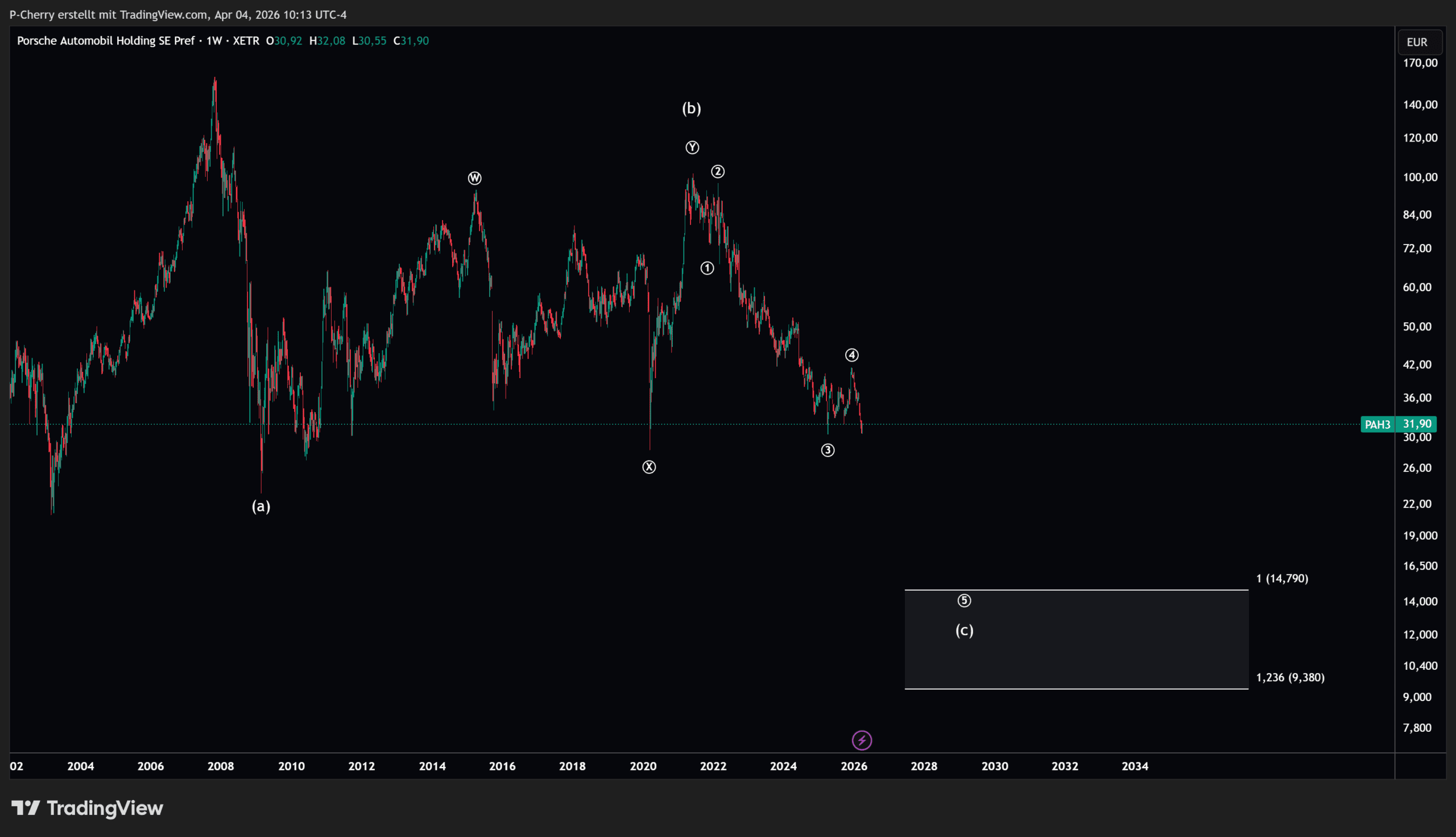 Die Elliott-Wellen-Analyse im Wochenchart zeigt, dass sich der Kurs der Porsche-Aktie in einer großen und langwierigen A-B-C-Korrektur befindet. Der Abschluss der C-Welle ist noch unvollständig. Entsprechend wäre zu erwarten, dass der Kurs das Tief der Welle A bei 23,18 € vom 23. Februar 2009 noch unterschreiten wird.