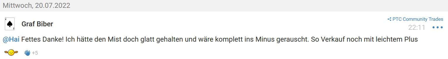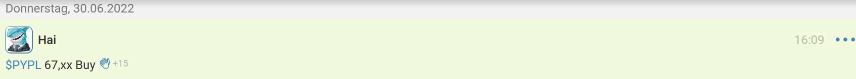 Mit Sommerbeginn und während der urlaubsbedingten Abwesenheit von Biotech-Aktien-Koryphäe „pharmaeagle“ (Userkommentar: „Auch einer der absolut Größten hier, konstant am liefern wie ein Pizzabote“) verstärkte „Hai“ seine Aktivität im Kanal PTC Community Trades: Am 30. Juni folgte die nächste konkrete Kaufansage bei der allseits bekannten PayPal. Lächerliche 67-68$ wurden für eine Aktie des zuvor übertrieben abgestraften Zahlungsgiganten gezahlt. Gestern, nur 5 Wochen später, erreichte der Titel nach einem erwarteten Sentiment-Umschwung und Mut machenden Earnings wieder dreistellige Notierungen und schoss bis auf 101,95 US$ in die Höhe – die nächsten +50% wurden eingefahren!
