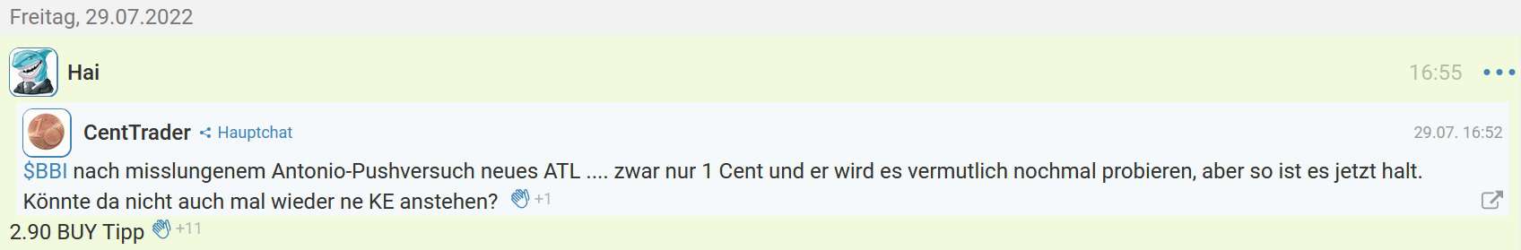 Spekulativer wurde es am 16. Juli: Die Aktie von Tonix Pharmaceuticals wurde klar als „Zock“ deklariert. PTC-Mitglieder bretterten dennoch volle Kanne in den Wert rein und zahlten lediglich Preise unter 1,30 US$. Weniger als 2 Wochen später, am 29. Juli, erklomm die Nano-Cap-Aktie deutlich höhere Sphären und schoss unter riesigen Umsätzen bis auf 2,24 US$ durch die Decke. Eine Rendite von mindestens +74% für PTC-Mitglieder in kürzester Zeit – für simples Folgen nicht so schlecht...