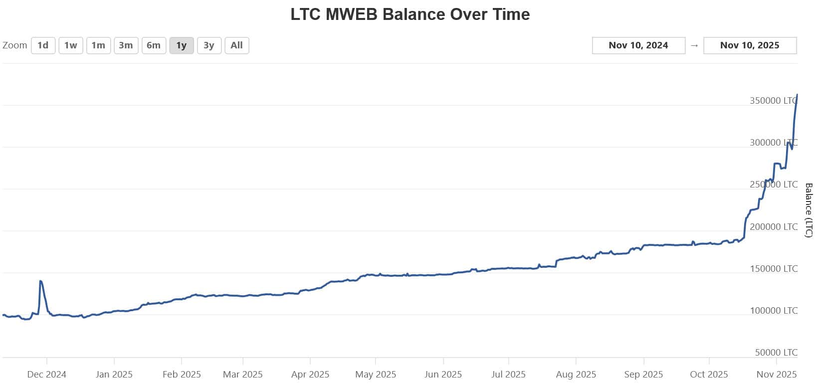 Während MWEB zu Beginn nach seiner Aktivierung nur zögerlich genutzt wurde, setzte ab dem Sommer 2025 ein deutlicher Trend ein. Immer mehr Nutzer und Wallet-Anbieter integrierten die Option, Litecoin-Transaktionen vertraulich und anonymisiert über MWEB abzuwickeln. Diese Entwicklung führt zu einem exponentiellen Wachstum: Innerhalb weniger Wochen hat sich das Volumen der im MWEB gebundenen Litecoins verdoppelt. Die Kurve, die die Gesamtmenge der MWEB-Coins zeigt, ist mittlerweile fast vertikal nach oben geschossen. Von einer Nischenfunktion ist MWEB zu einem zentralen Bestandteil des Litecoin-Ökosystems geworden.