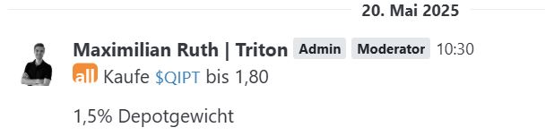 Maximilian Ruth empfahl den Kauf der Aktie (Kürzel: QIPT) bis zu einem Kurs von 1,80 US$ und gab den NBC-Anlegern auch eine Gewichtung an die Hand. Im vorbörslichen Handel konnten die Club-Mitglieder gemütlich einkaufen, und das sogar zu noch günstigeren Kursen um die 1,70 bis 1,75 US$.