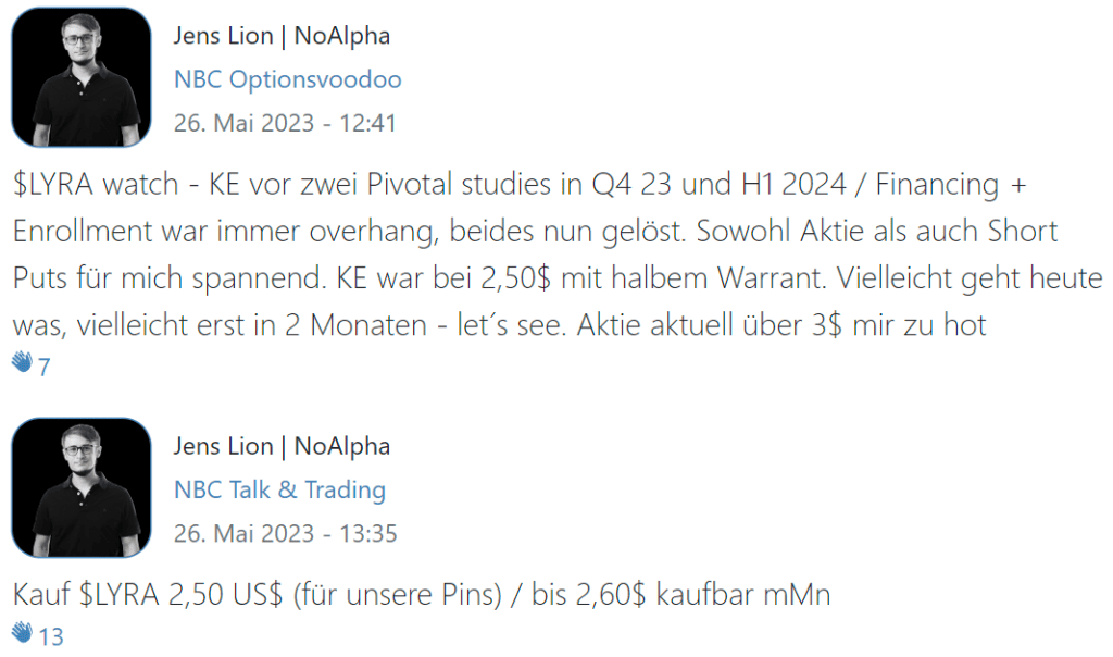 Lyra kümmert sich besonders um jene Patienten, bei denen die Entzündung und Symptome einfach nicht abebben wollen – sowohl vor als auch nach einer eventuellen Operation. Jens Lion empfahl seinen Mitgliedern zu den optimalen Kursen nach Verkündung der lange erwarteten Kapitalerhöhung bis 2,50 USD zu kaufen: