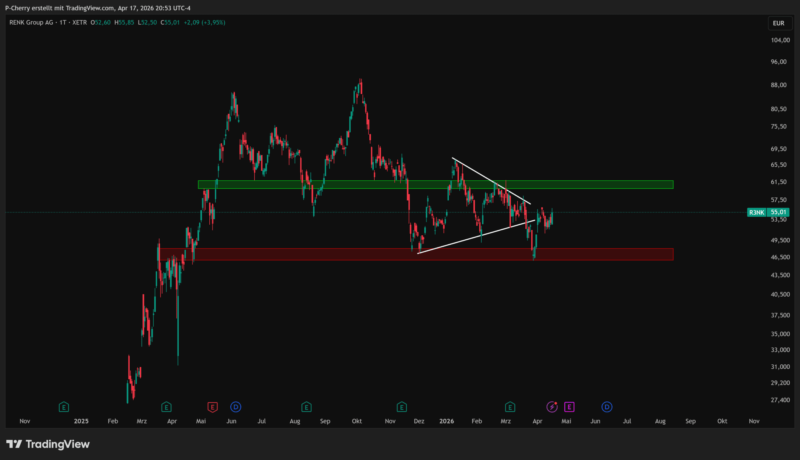 Die Renk-Aktie befindet sich nach der dynamischen Aufwärtsbewegung im Jahr 2025 aktuell in einer Korrekturphase. Nach dem Hoch oberhalb von 90 € im Herbst setzte eine spürbare Abwärtsbewegung ein. In der Folge fiel der Kurs bis in die rote Unterstützungszone zwischen 46 € und 48 €, wo sich derzeit erste Anzeichen einer Stabilisierung zeigen.