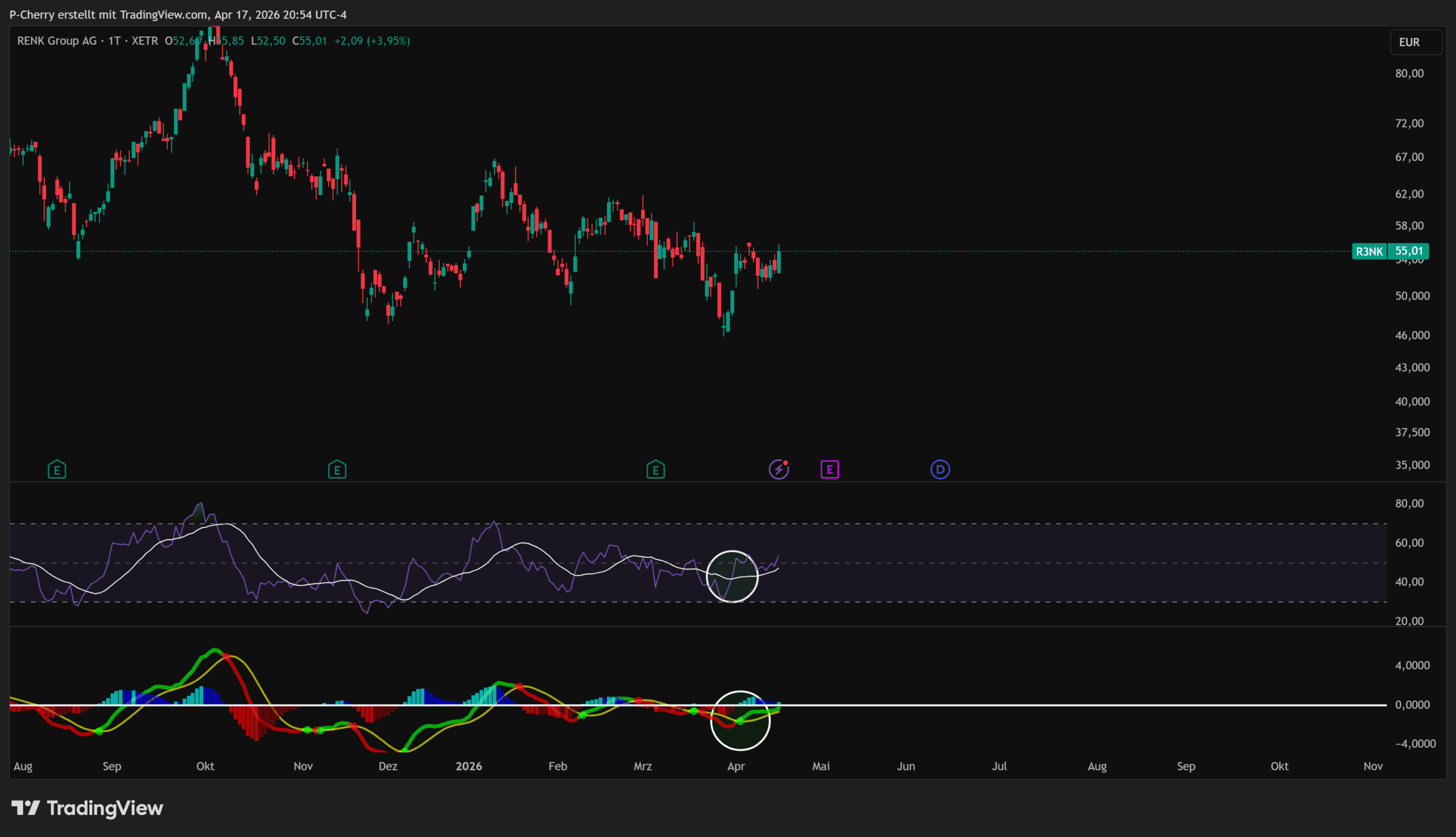 Die Renk-Aktie zeigt nach dem Rebound von über +22% vom Tief erste klare Stabilisierungssignale. RSI und MACD liefern bullische Signale, während auch auf Wochenbasis erste positive Tendenzen sichtbar werden.