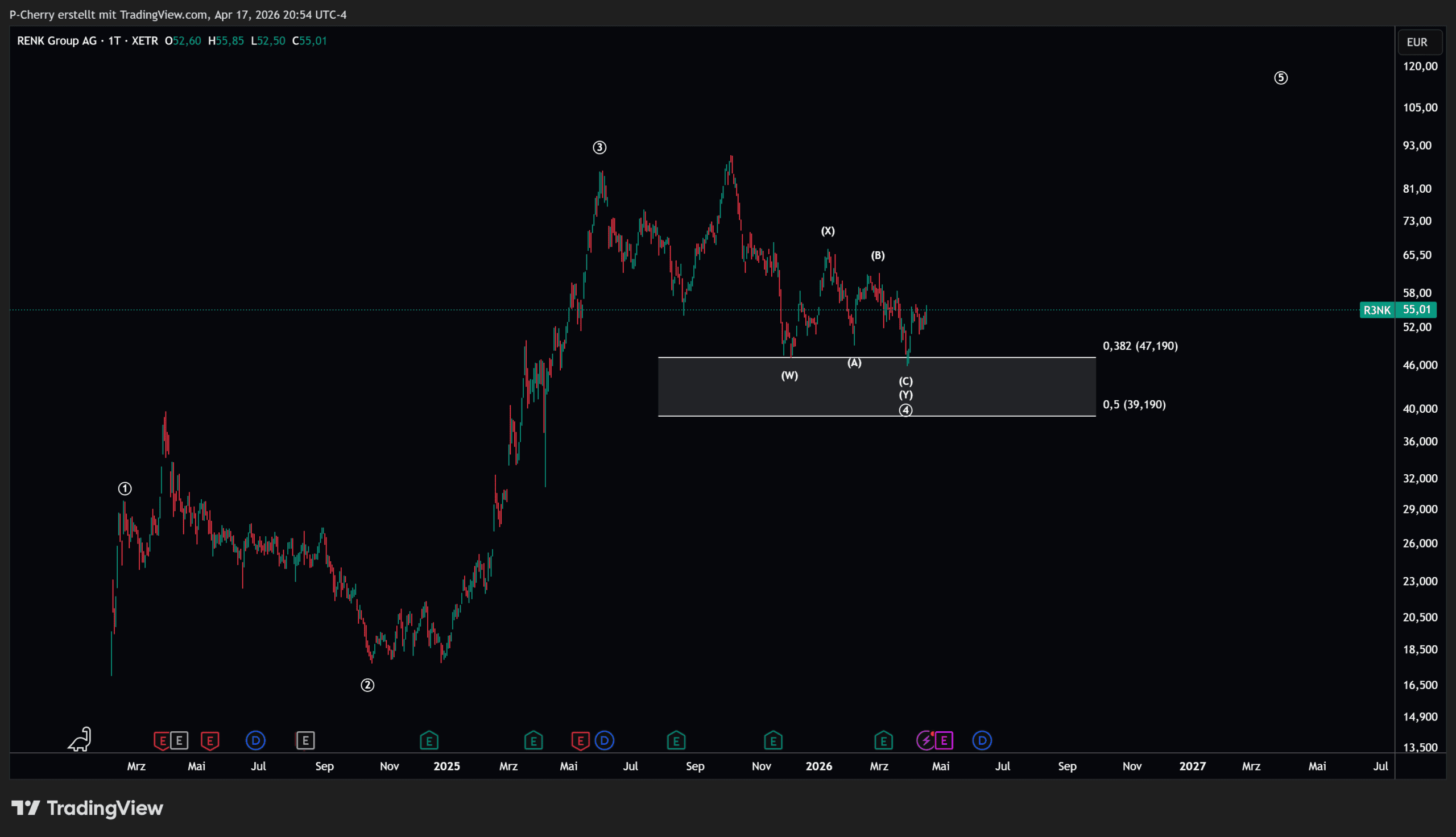 Im Tageschart der Renk-Aktie lässt sich eine übergeordnete, bullische Elliott-Wellen-Struktur erkennen. Nach dem starken impulsiven Anstieg der Welle 3, die im Bereich von knappen 90 € ihren Höhepunkt fand, befindet sich der Kurs aktuell in einer ausgedehnten Korrekturphase der Welle 4.