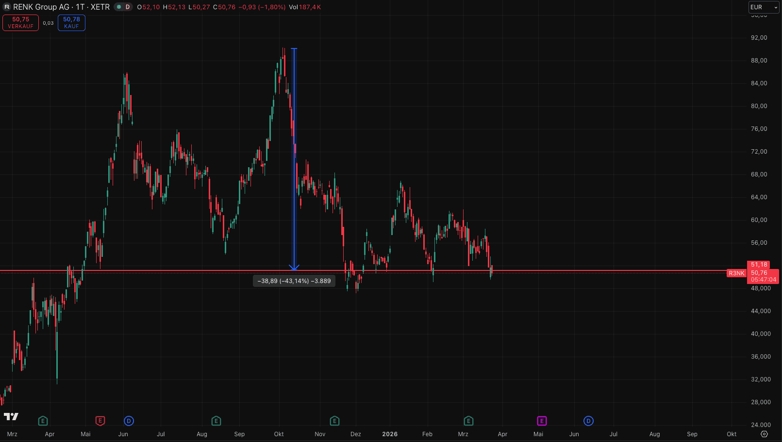 Charttechnisch zeigt sich eine deutliche Korrekturbewegung. Vom Hoch im Oktober bei rund 90 € hat die Aktie inzwischen über -40% an Wert verloren. Aktuell notiert Renk im Bereich um 50 € und damit in einer Zone, die bereits mehrfach angelaufen wurde. Sowohl im Februar als auch zuletzt im März kam es zu mehreren Tests dieses Bereichs. Damit rückt diese Zone klar als Unterstützung in den Fokus.