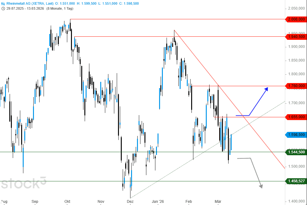 Ein nochmaliger Rückgang unter 1.545 € könnte hingegen den Druck auf die Aktie erhöhen. In der Konsequenz müsste man neue Mehrmonatstiefs einkalkulieren. Der nächste Unterstützungspunkt wäre hierbei auch erst im Bereich der Tiefs vom Dezember 2025 bei rund 1.458 € zu definieren.