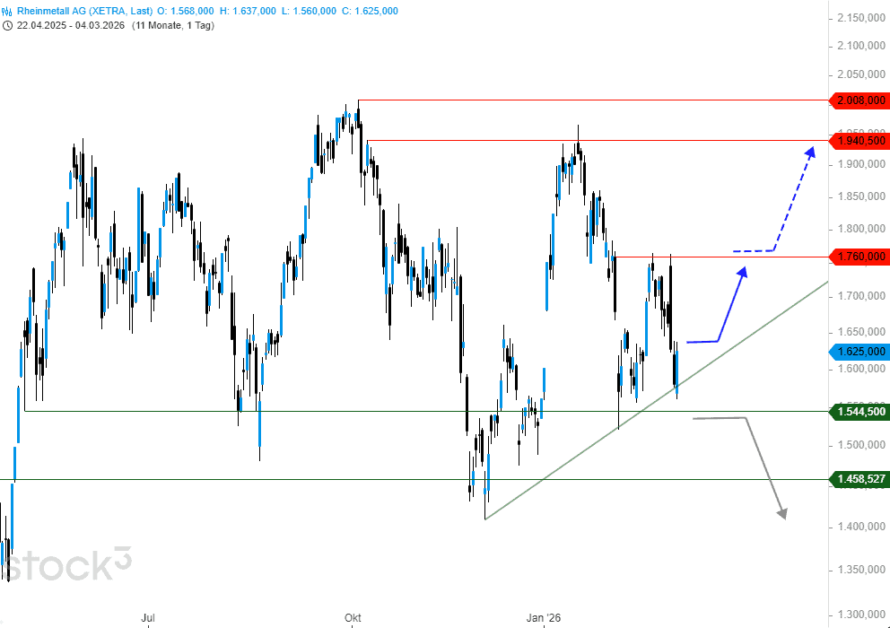 Auch wenn aufgrund des Angriffs auf den Iran die Rüstungsaktien profitieren sollten, so zeigt sich dies bislang nicht am Chartverlauf der Rheinmetall-Aktie. Zur heutigen Wochenmitte jedoch mit einer positiven Kursentwicklung, wirkt die Lage trotz angespannter Situation für einen weiteren Aufwärtsimpuls aussichtsreich.