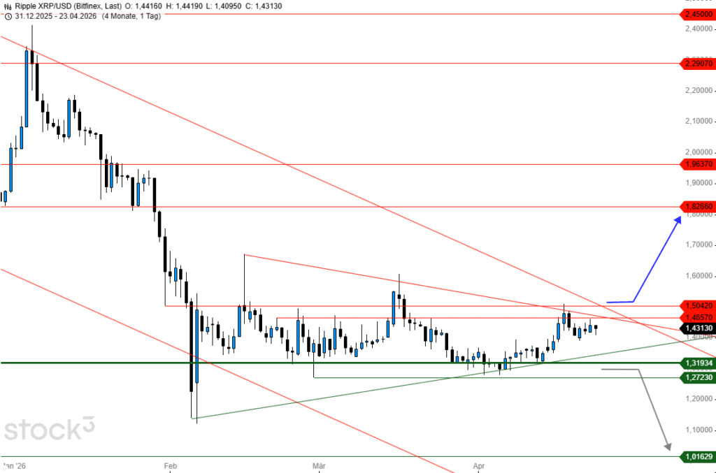 Der klare Trigger auf der Nordseite ist die Marke von 1,50 US$. Darüber muss XRP/USD per Tagesschlussstand ansteigen, um weiteres Potenzial zu entfalten. Gelingt dies, sollte weiteres Momentum dazu führen, dass rasche Zugewinne bis in den Bereich von 1,75 bis 1,83 US$ erfolgen dürften.