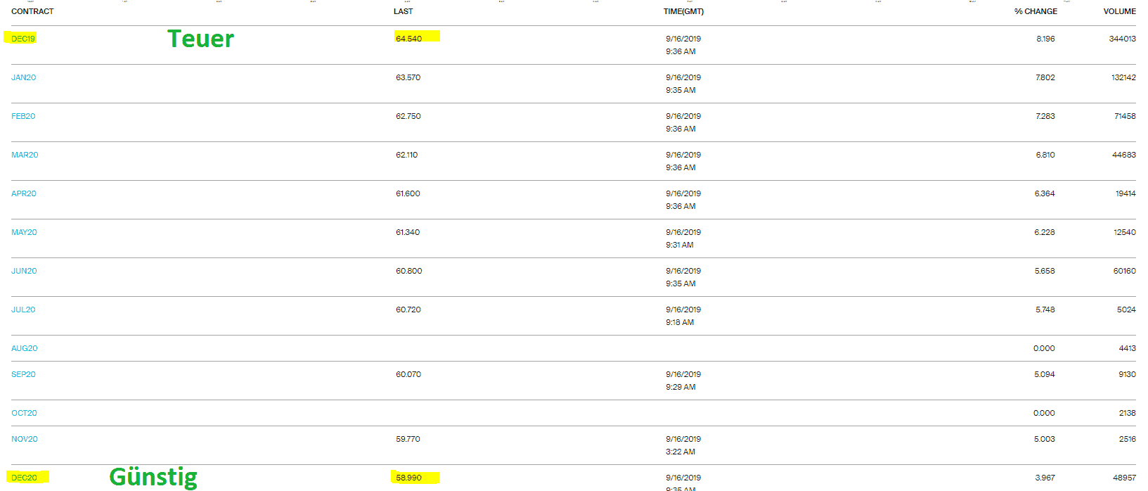 Dass der Rohölpreis heute, im meistgehandelten Future, dem Liefermonat Dezember 2019, stark steigen würde, ist logisch nachvollziehbar. Doch die späteren Future-Termine haben bisher kaum auf die sich zuspitzende Lage im Nahen Osten reagiert und überhaupt gar nicht sind die Analysten wegen der Versorgungslage besorgt, die sich immer weiter zuspitzt.