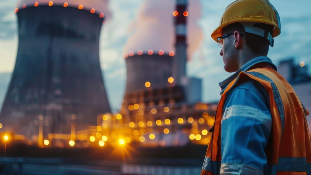 Worker in hard hat and orange safety vest at an industrial site with cooling towers in the background at dusk.