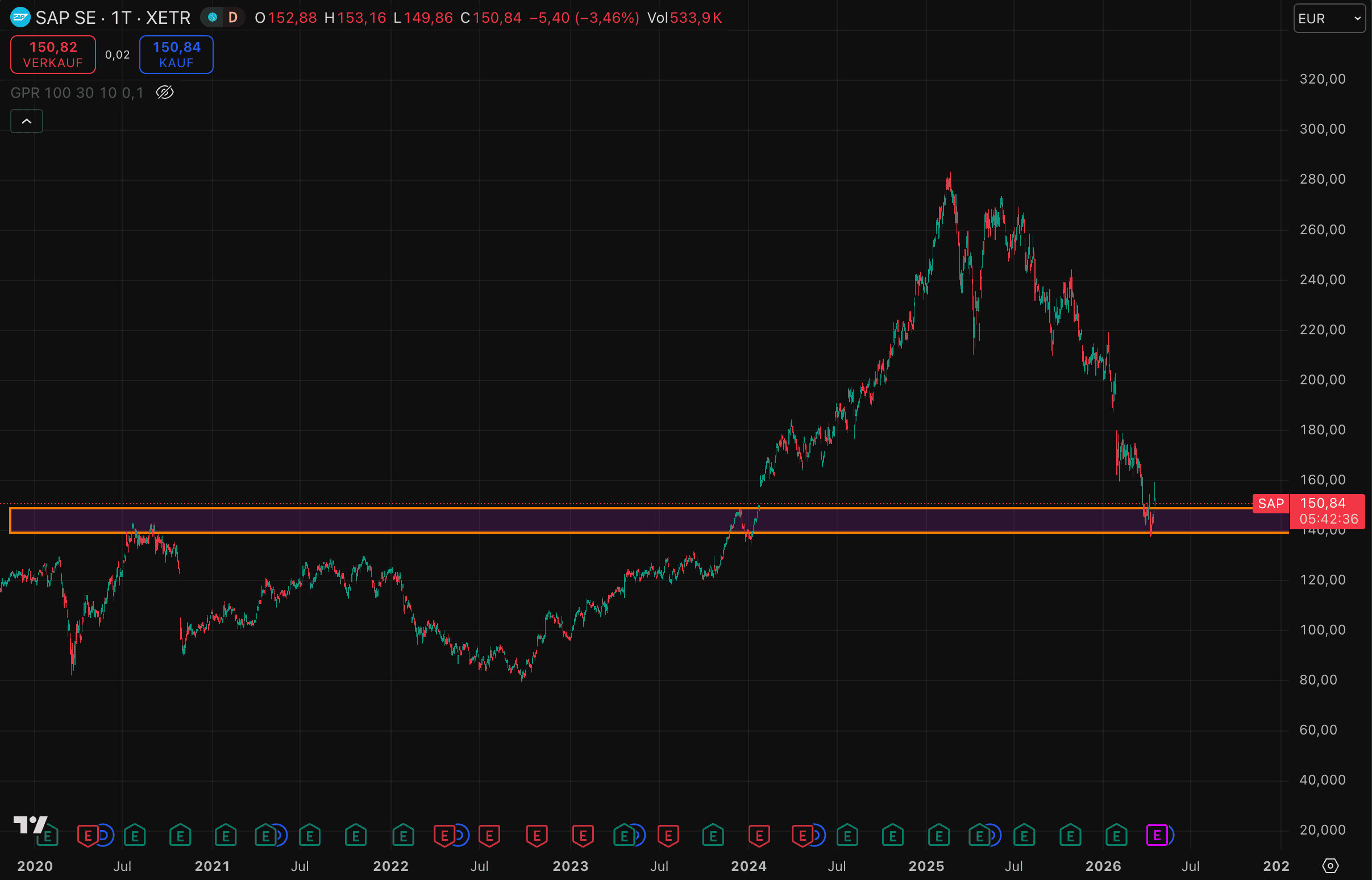 Charttechnisch notiert die SAP-Aktie aktuell in einem Bereich, der bereits in der Vergangenheit eine wichtige Rolle gespielt hat. Die Zone zwischen 140 und 150 € hat sich sowohl im Jahr 2020 als auch 2023 als Widerstandsbereich etabliert. Dass sich der Kurs nun wieder in diesem Bereich bewegt, macht die Situation besonders interessant. Solche Zonen dienen häufig als Orientierung für Marktteilnehmer, da hier in der Vergangenheit verstärkt Kauf- oder Verkaufsentscheidungen getroffen wurden.