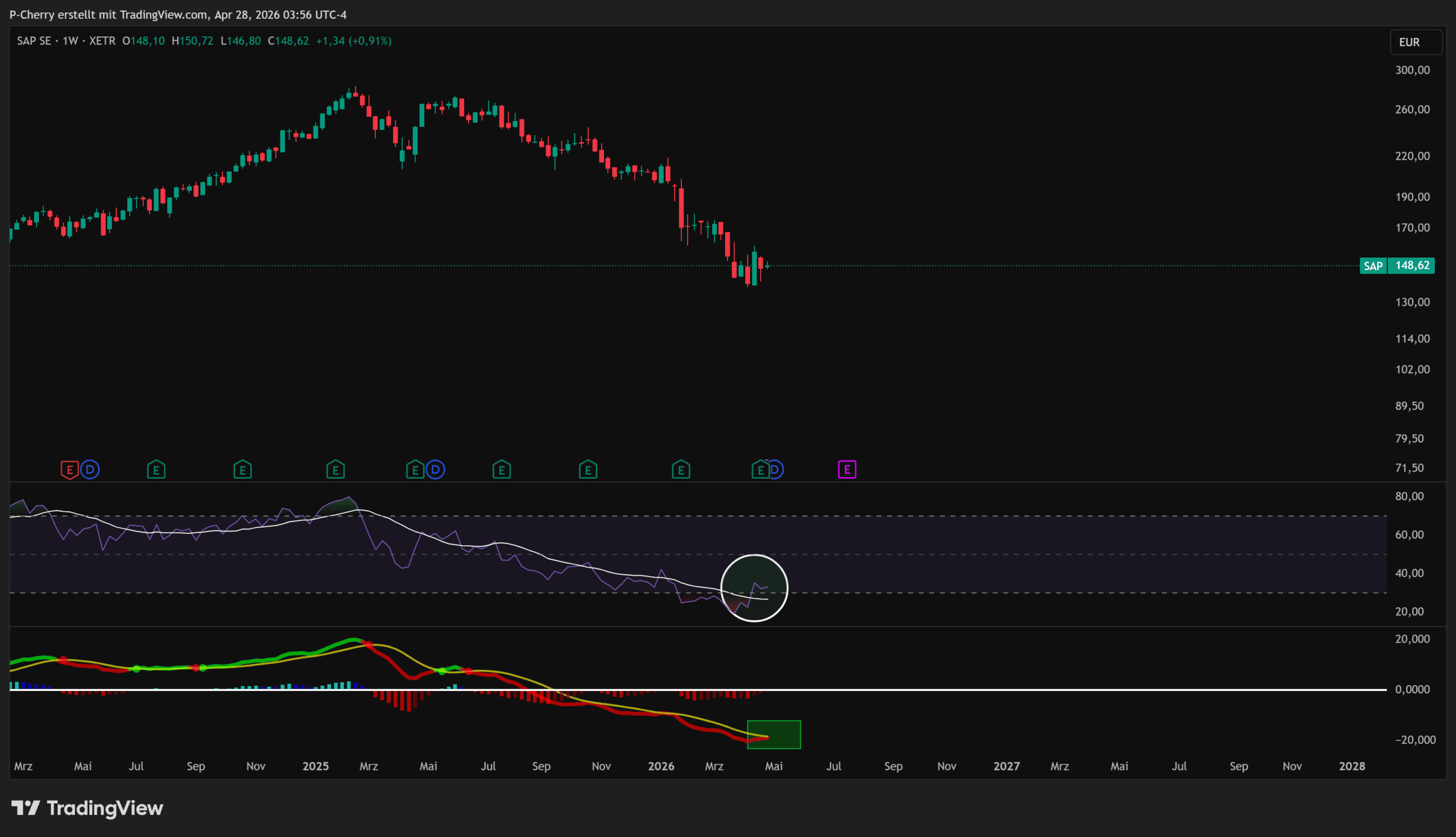 Die Indikatoren senden erste Aufhellungssignale. Der RSI hat im Wochenchart ein bullisches Crossover gebildet, während der MACD kurz vor einem möglichen Kaufsignal steht. Kurzfristig wirkt die SAP-Aktie damit stabilisiert und technisch verbessert.