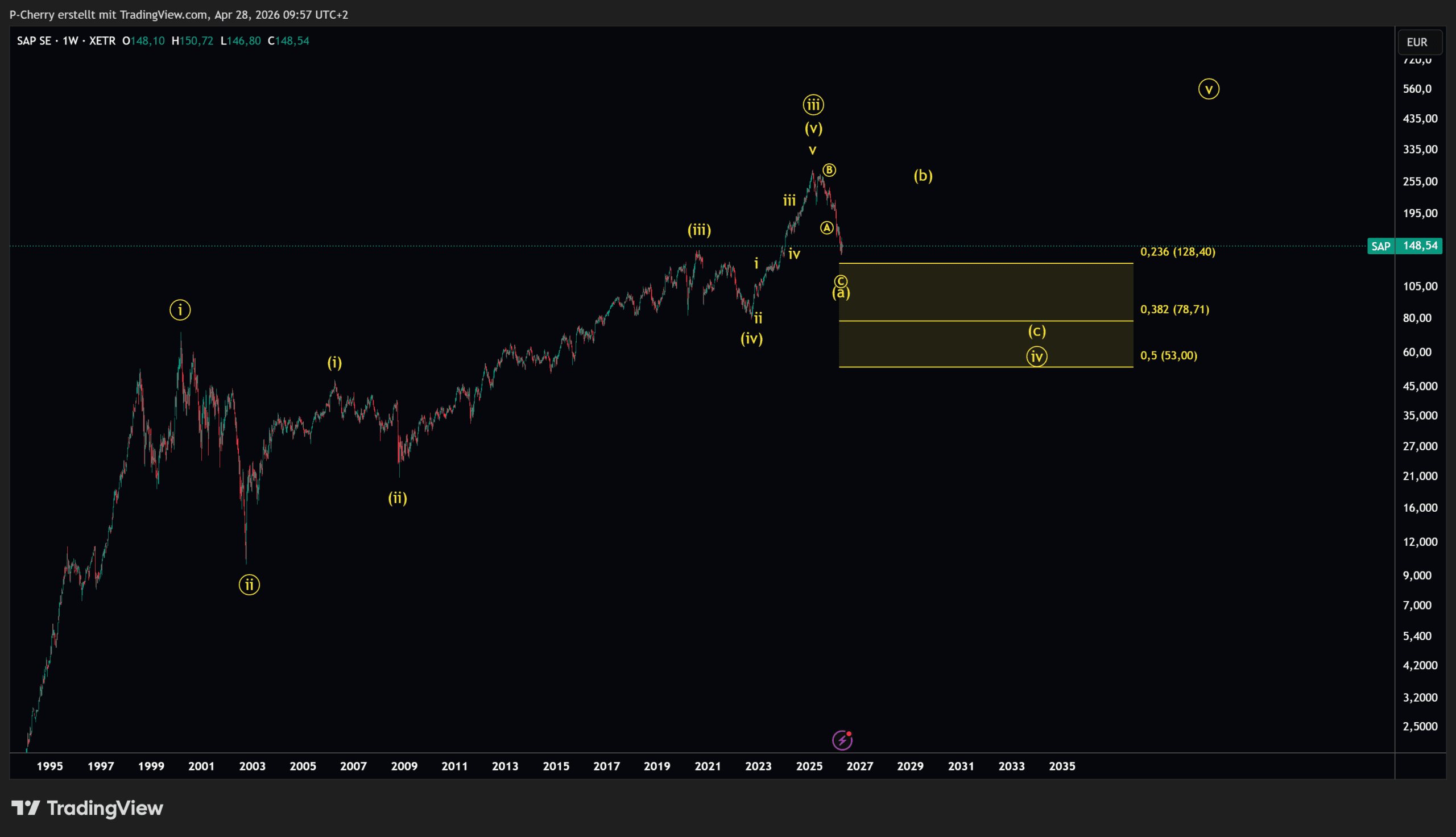 Im Wochenchart der SAP-Aktie lässt sich eine übergeordnete bullische Struktur erkennen. Jedoch erweckt die zeitliche Ausdehnung der Korrektur den Eindruck, als sei dies erst der erste Teil einer größeren A-B-C-Korrektur. Nach dem starken und impulsiven Anstieg der Welle 3 (röm. iii), die bei 283,50 € ihren Höhepunkt fand, befindet sich der Kurs aktuell in einer Korrekturphase der Welle 4.