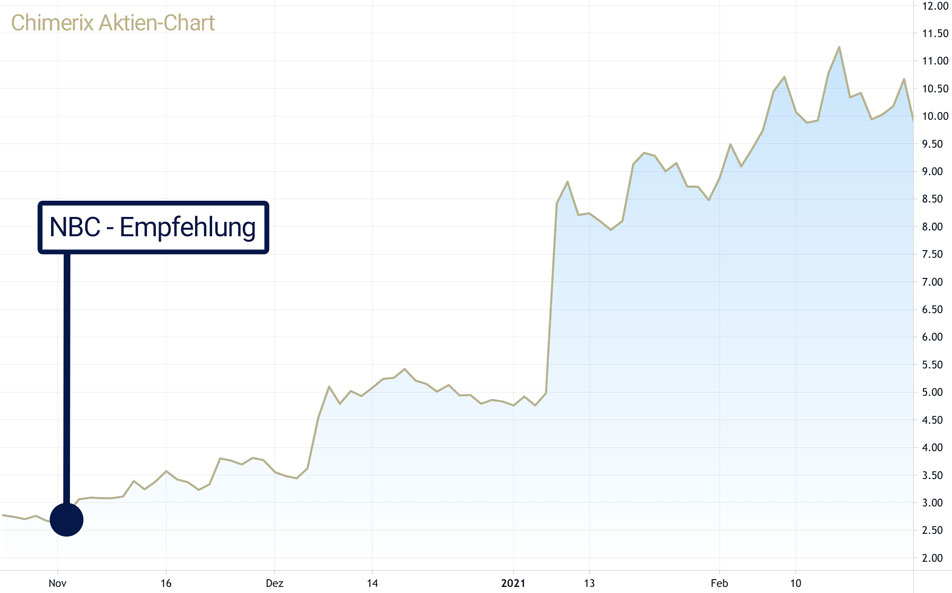Die Aktie von IVERIC bio war einer unser Top-Favoriten des Jahres 2019. Monatelang empfahlen wir stur: "Stark Kaufen". Noch im gleichen Jahr feierten NBCler einen Kurszuwachs von +896%. Fast +500% wurden in nur 7 Wochen erreicht.