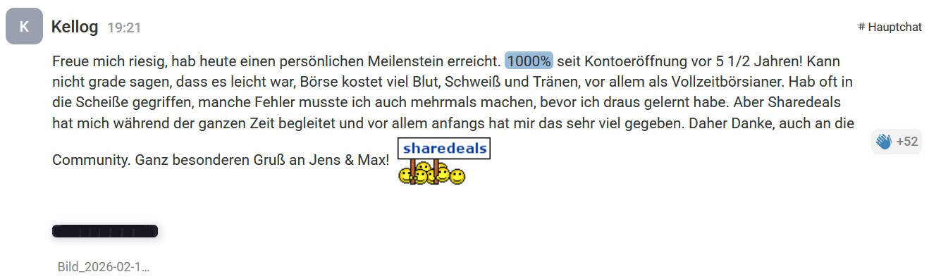 Ein zentraler Erfolgsfaktor für Kellog war die Begleitung durch unsere weltweit einmalige Community: sharedealsPlus. Gerade in der Anfangszeit habe ihm der Austausch, die Diskussionen über Aktientipps und die gemeinsamen Analysen enorm geholfen. Der Dialog mit Gleichgesinnten, neue Perspektiven auf Unternehmen und Märkte sowie die Motivation durch andere ambitionierte Anleger haben ihn auf seinem Weg entscheidend unterstützt. In seiner Nachricht bedankt er sich ausdrücklich bei der Community und richtet einen besonderen Gruß unteren anderem an No Brainer Club-Chefanalyst Maximilian – ein starkes Zeichen für den Zusammenhalt und die Qualität des Austauschs.