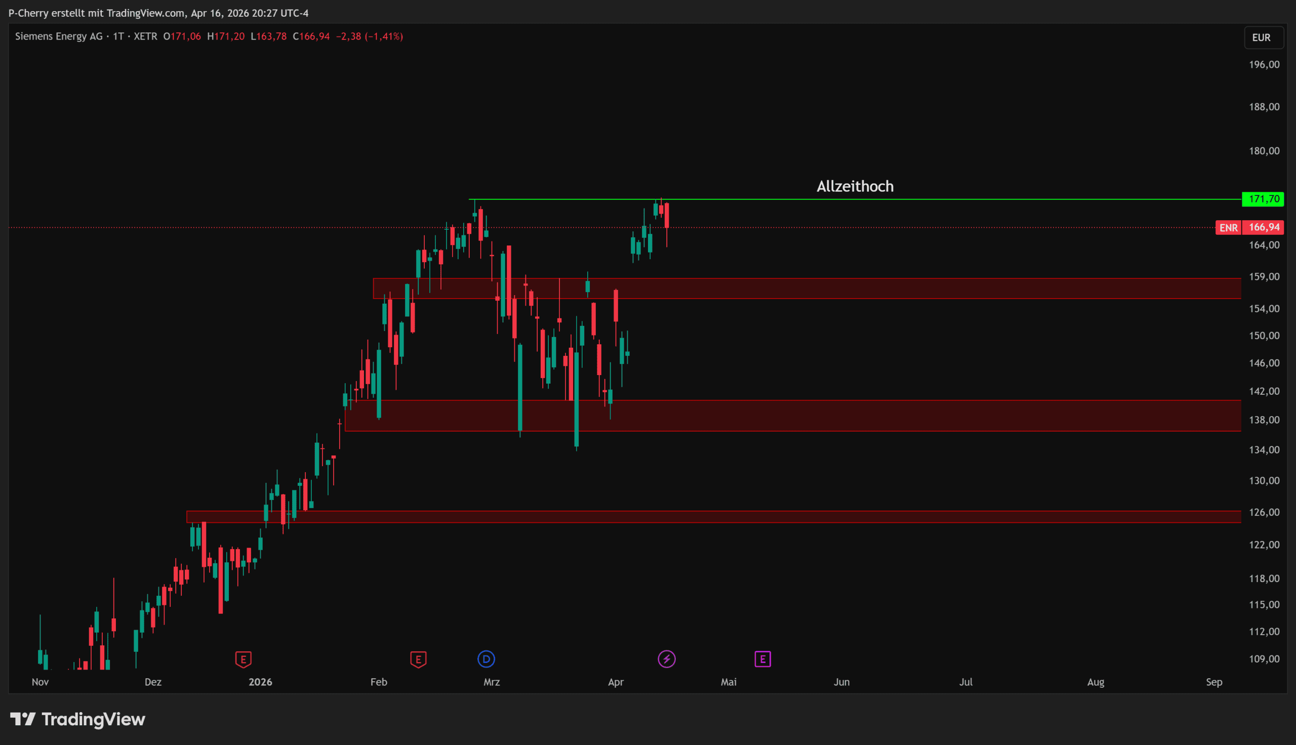 Weiterhin hatte der Kurs der Siemens Energy-Aktie am 08. April 2026 mit einer ordentlichen Kurslücke von knapp +7 Prozent eröffnet. Solche Gaps sind für viele Gap-Trader nahezu eine Einladung, den Kurs noch einmal runter zu drücken um die Kurslücke zu schließen. Die Lücke beginnt bei 150,78 €.
