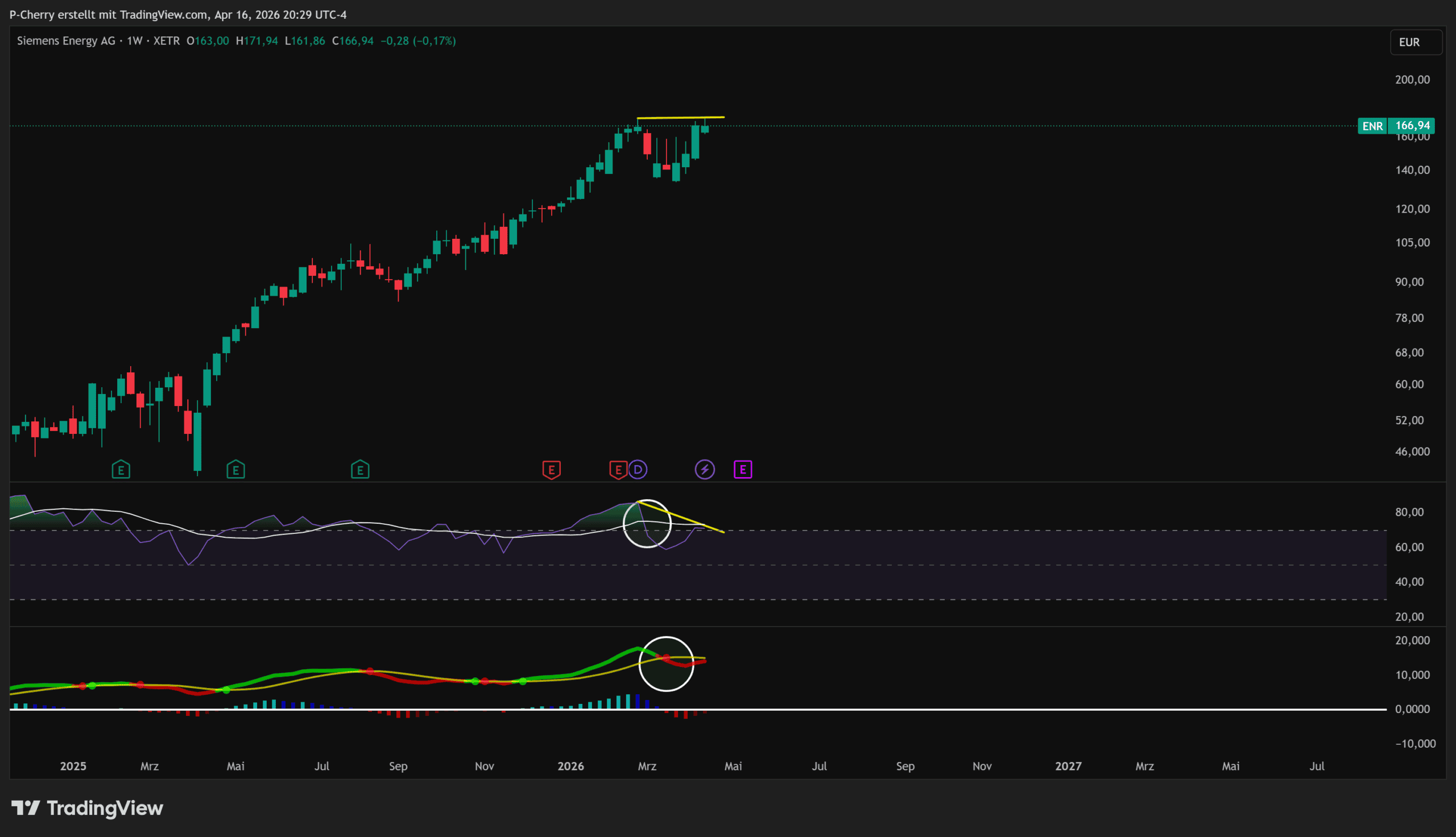 Die Siemens Energy-Aktie zeigt nach dem Rekordhoch erste Schwächesignale und steht kurzfristig unter dem Eindruck von Gewinnmitnahmen. RSI und MACD liefern im Wochenchart bärische Signale, während die bärische Divergenz auf nachlassendes Momentum hinweist.