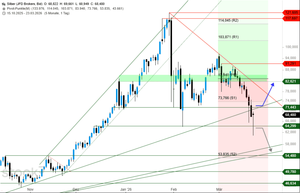 Die sich eintrübende Situation bei den Edelmetallen sowie speziell auch dem Silberpreis erfuhr zum heutigen Wochenstart den nächsten Tiefschlag. Mit knapp -12% in der Spitze verlor Silber zu Beginn des Auftakts an Wert, und doch drehte die Stimmung rund um die Mittagszeit schlagartig, sodass sich ein starkes Reversal in der Tageskerze abzeichnet. Die Chartsituation bleibt allerdings durchweg angespannt.