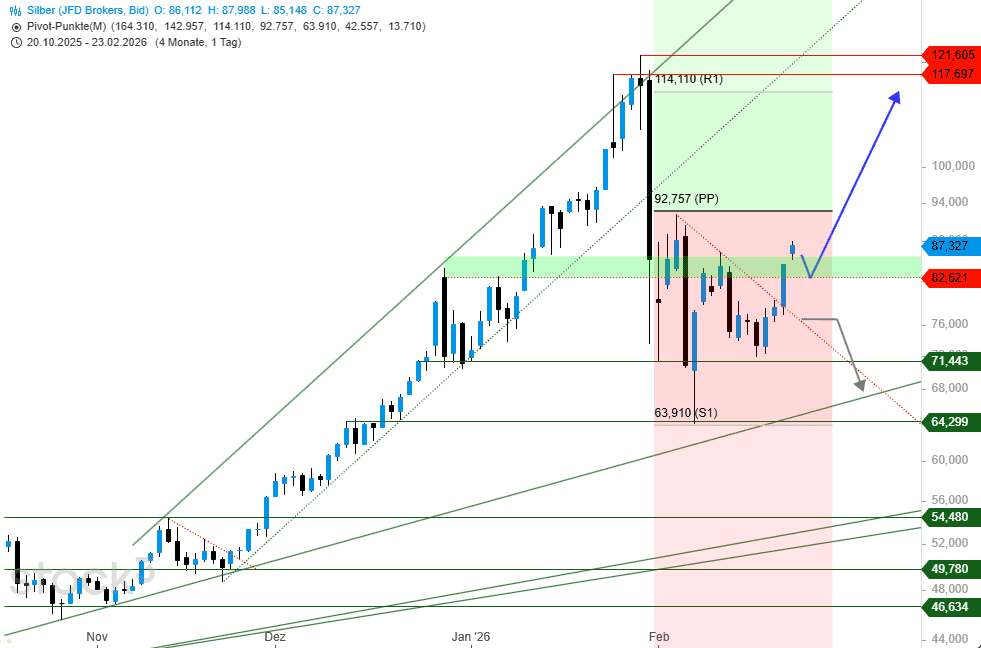 Die Schwankungsfreudigkeit bei Silber bleibt erhalten, und so schnell änderte sich das leicht bärisch wirkende Bild der Vorwoche in eine nunmehr freundlichere Erscheinung. Mit oder ohne Schließung des Up-Gaps erscheinen weitere Zugewinne bis zum Monats-Pivot-Punkt bei 92,75 USD$ unvermeidlich, bevor darüber wieder der dreistellige Preisbereich von Interesse sein dürfte.