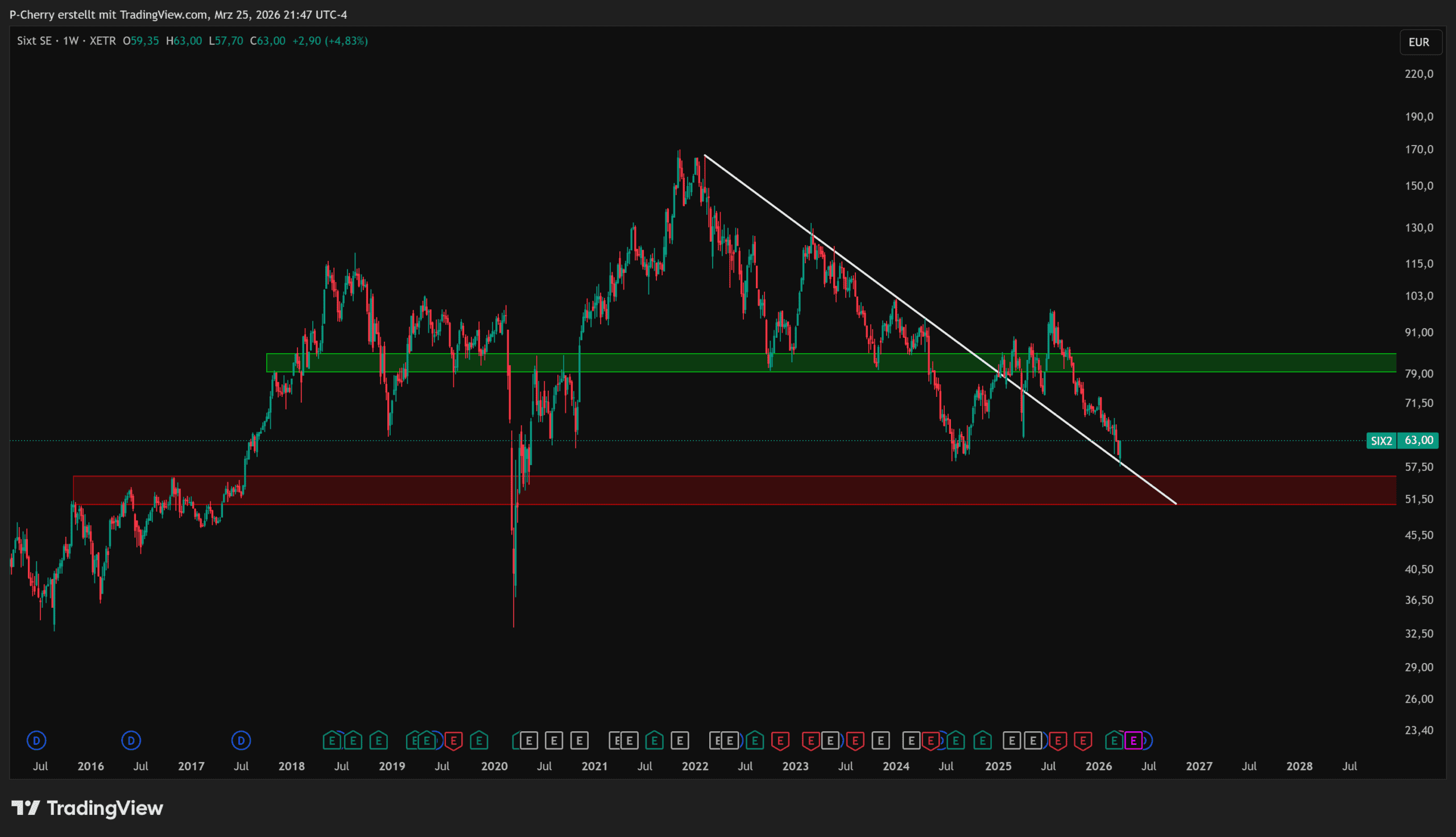 Der Kurs der Sixt-Aktie durchbrach die diagonal verlaufende Abwärtstrendlinie im Februar 2025 nach oben und fand ein vorübergehendes Top bei 98,70 €. Danach fiel der Kurs weitere -41%. Kürzlich wurde diese Trendlinie von oben angetestet und der Kurs schoss um +9% nach oben.