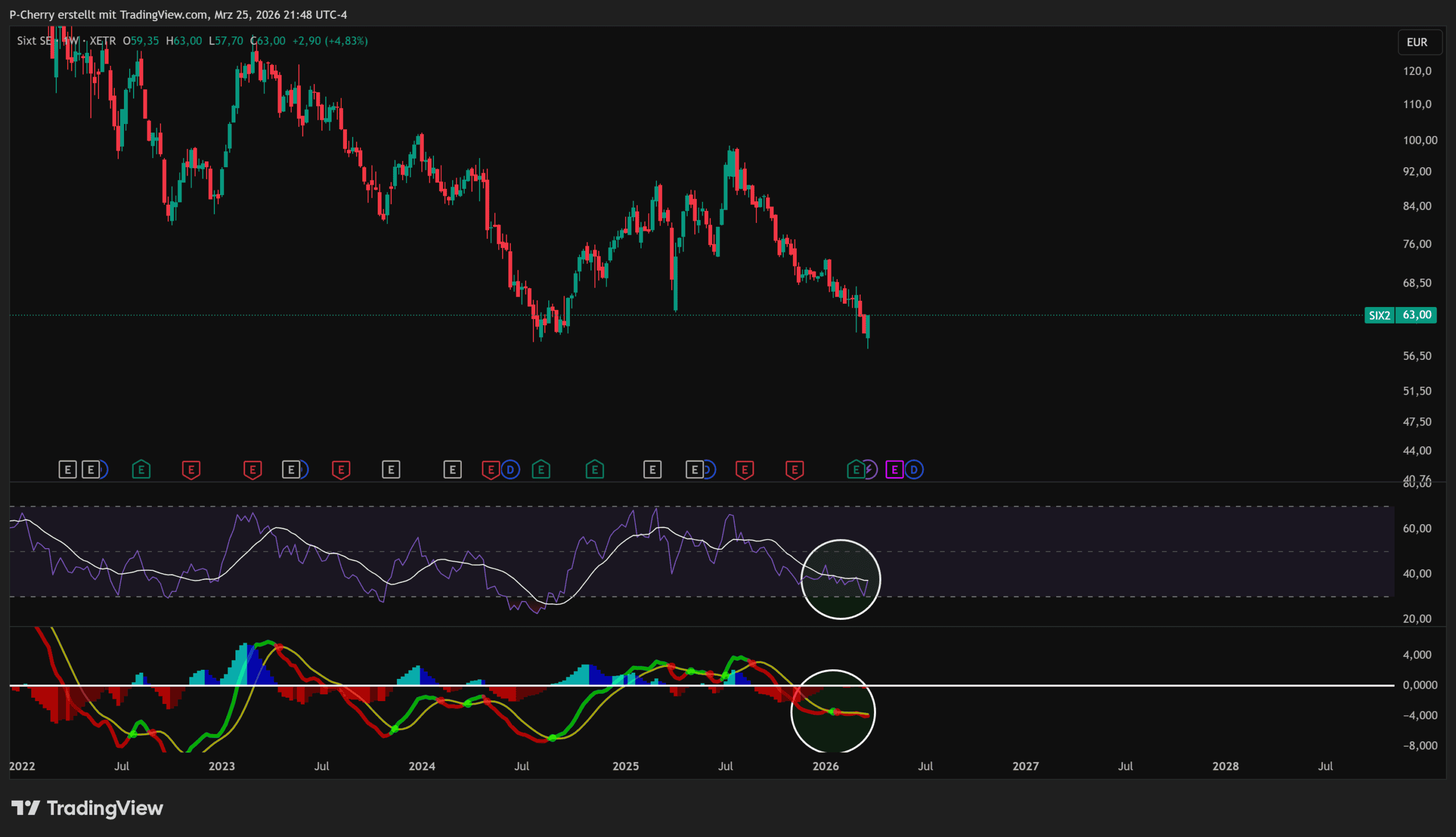 Aus technischer Sicht bleibt die Sixt-Aktie trotz der jüngsten Gegenbewegung in einem übergeordneten Abwärtstrend. Die bärischen Signale bei RSI und MACD sowie die Elliott-Wellen-Struktur sprechen weiterhin für anhaltenden Druck. Der Rebound von +9% wirkt bislang eher wie eine technische Erholung. Entscheidend wird nun sein, ob sich daraus mehr entwickelt oder die Abwärtsbewegung in Form der Welle C fortgesetzt wird.