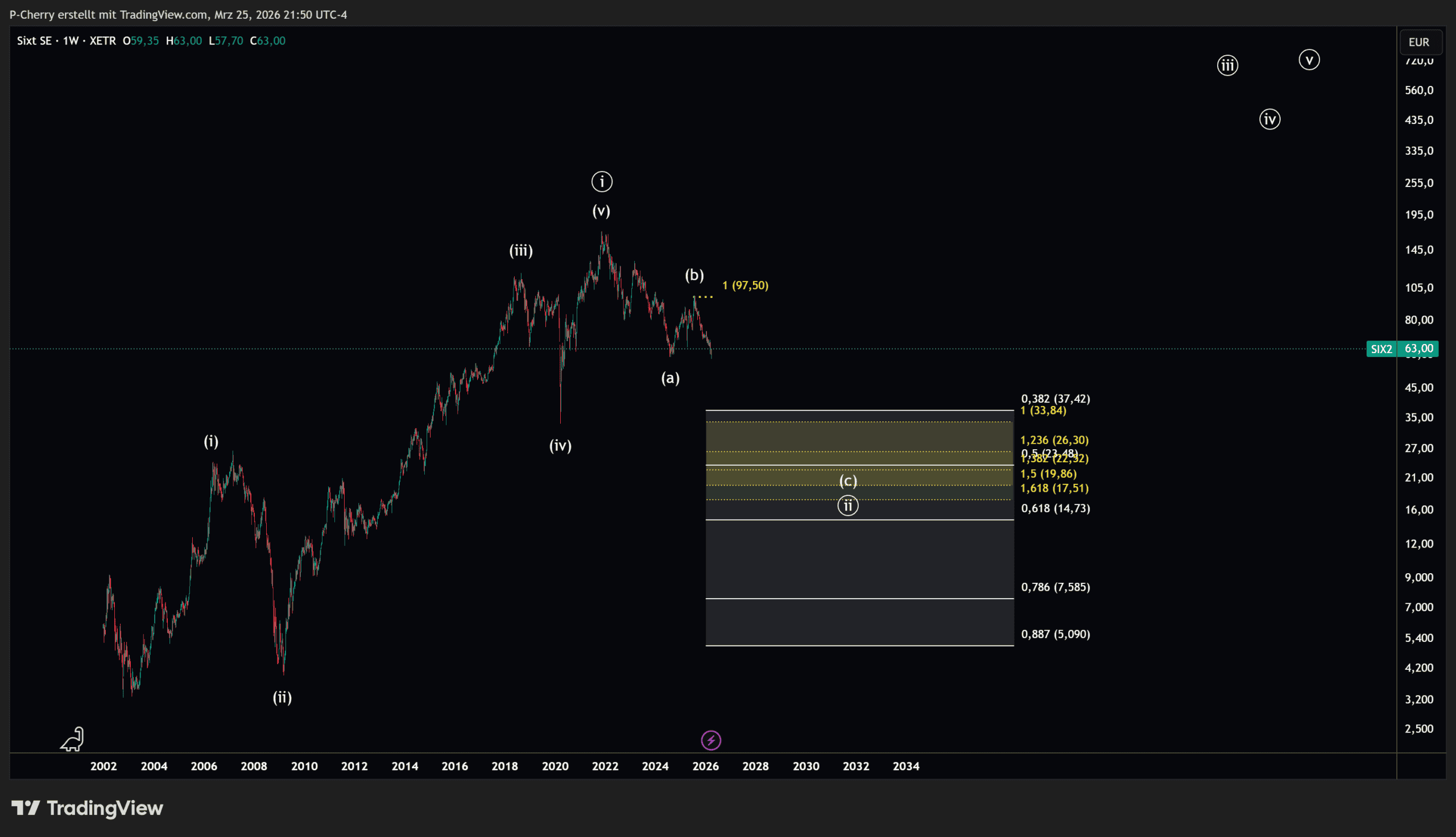 Im Wochenchart der Sixt-Aktie zeigt sich eine klare bärische Gesamtstruktur. Seit der Topbildung im November 2021 befindet sich der Kurs in einer anhaltenden Abwärtsbewegung. Dabei scheinen die Welle A und die Welle B einer A-B-C-Korrektur bereits abgeschlossen zu sein.